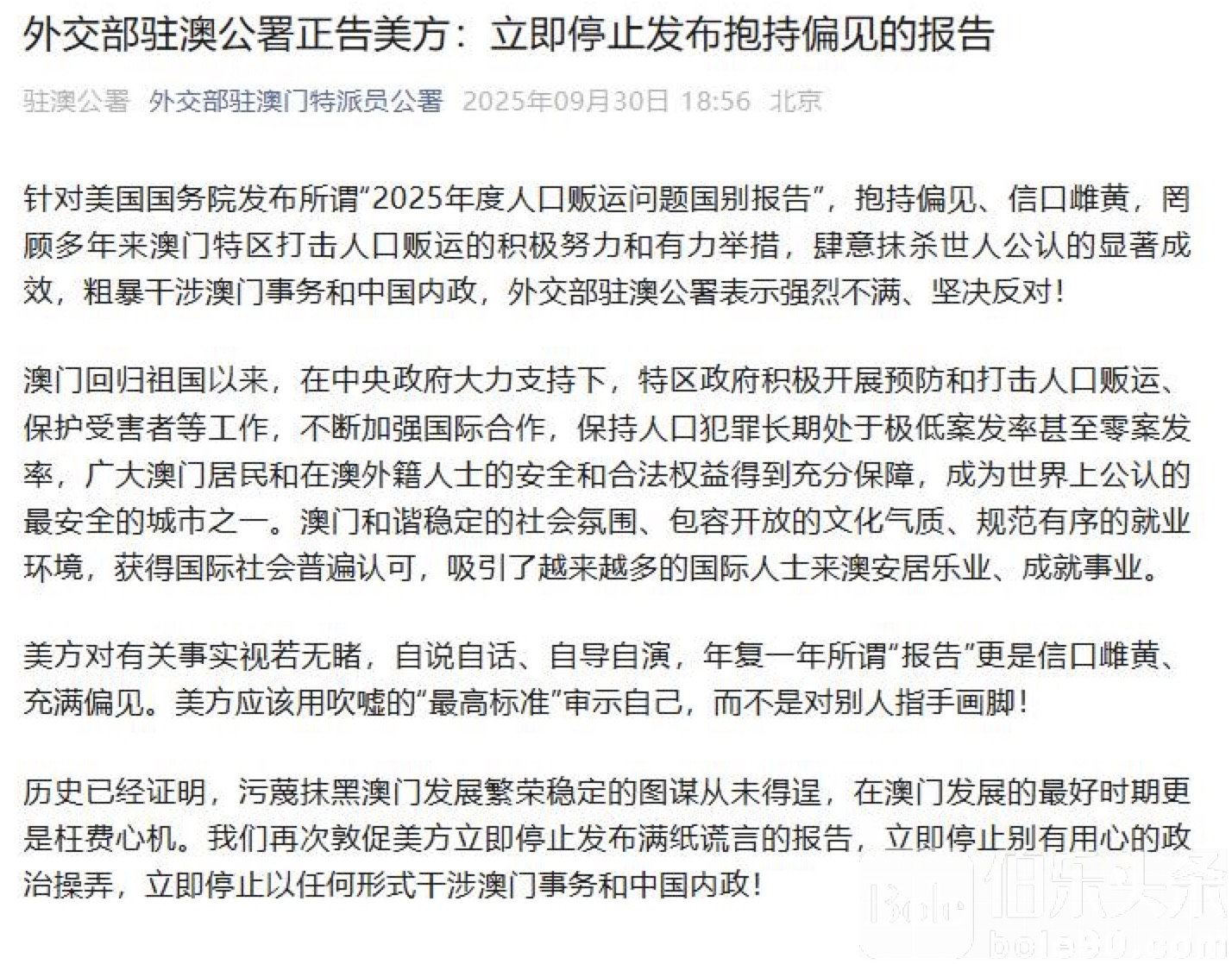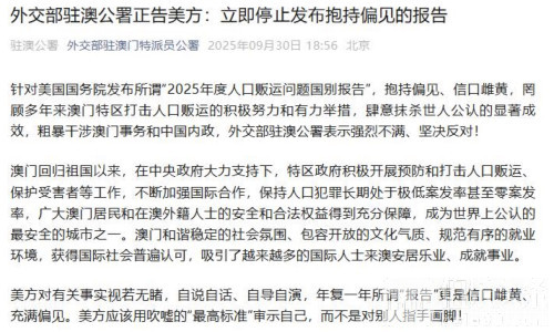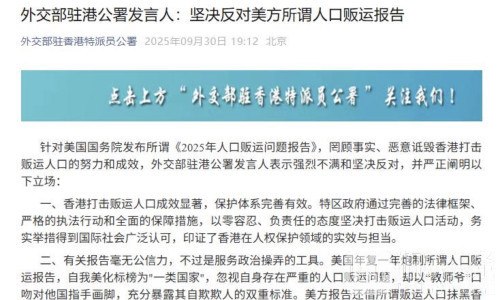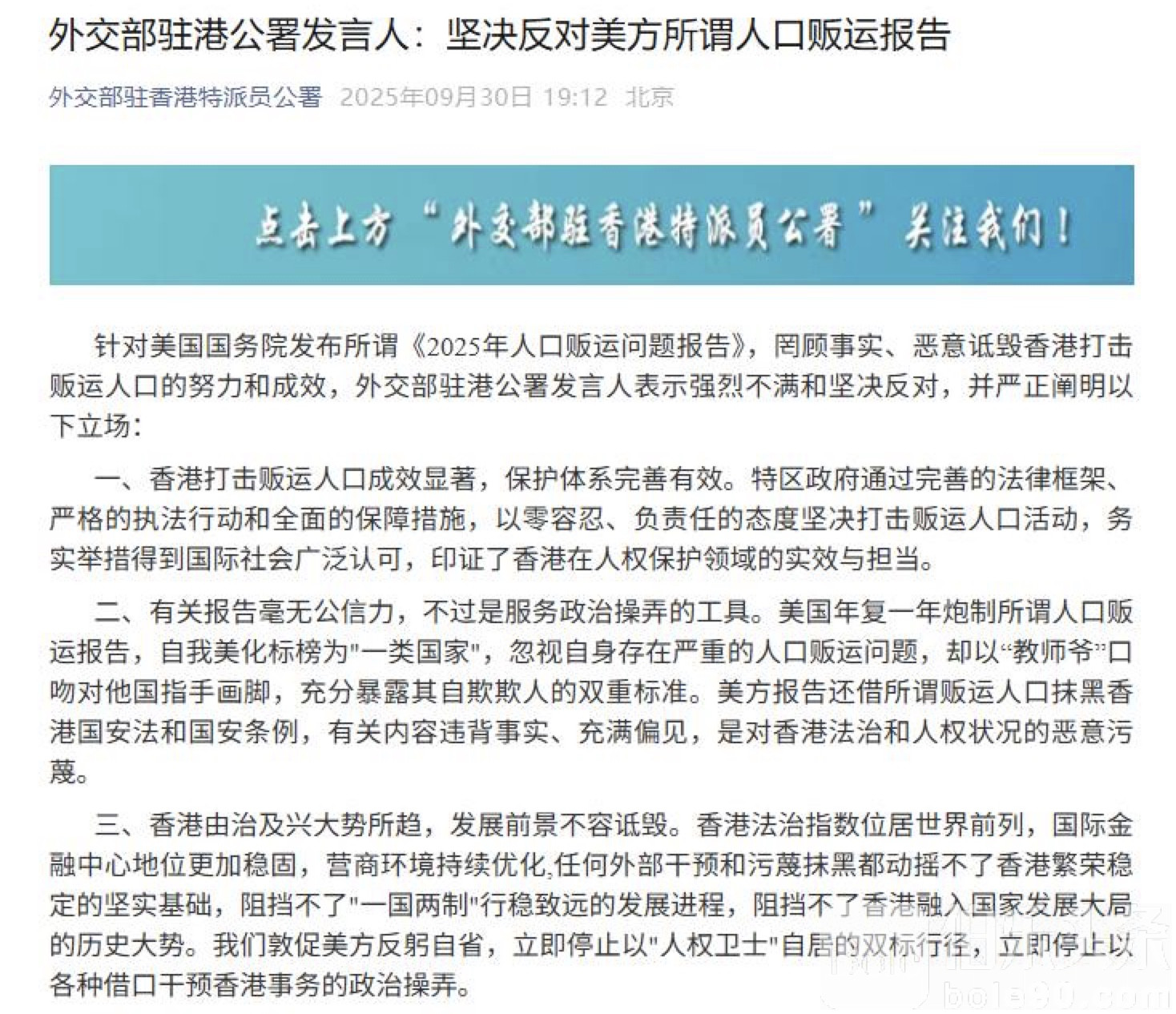 伯乐头条专讯:针对美国国务院发布的所谓《2025年人口贩运问题报告》,中方严正回应,称该报告完全颠倒黑白、恶意造谣,是一场政治闹剧。中方指出,香港在打击人口贩运方面成果显著,特区政府建立了完善法律体系,开展严格执法行动,并实施全面保障措施,以实际行动赢得国际社会广泛认可,彰显在人权保护上的担当。