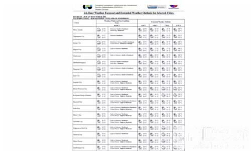 在菲律宾其他城市,如黎牙实比(Legazpi)、公主港(Puerto Princesa)、卡拉延群岛(Kalayaan Group of Islands)、宿务(Cebu)、伊洛伊洛(Iloilo)、塔克洛班(Tacloban)、卡加延德奥罗(Cagayan de Oro)、达沃(Davao)及三宝颜(Zamboanga)等地,预计将出现局部或间歇性阵雨与雷暴。