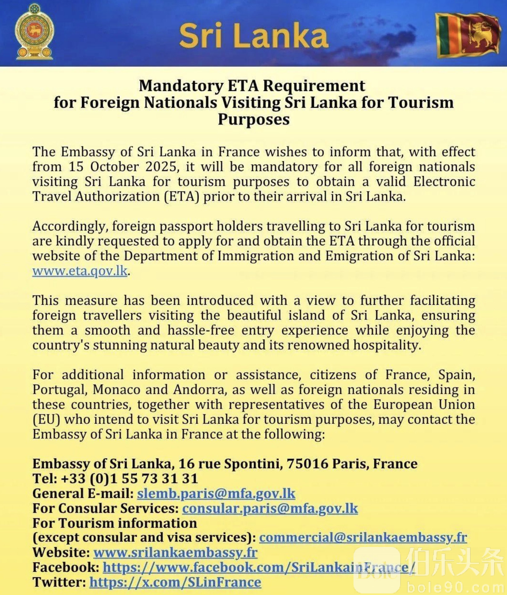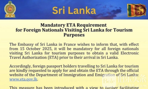 伯乐头条专讯:计划前往斯里兰卡的旅客注意了!从2025年10月15日起,斯里兰卡政府将全面取消落地签政策,所有入境旅客(包括中国游客)必须提前在线申请电子旅行授权(ETA),否则将被拒绝入境或原机遣返