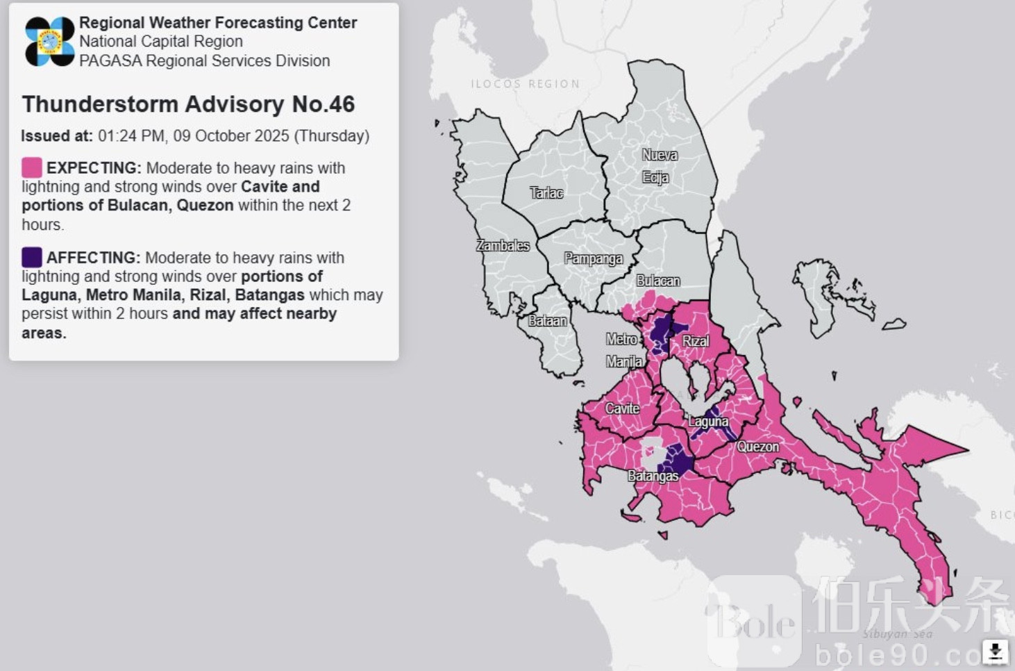 伯乐头条专讯:菲律宾气象局(PAGASA)周四下午发布雷暴警报,指出马尼拉都会区及吕宋岛三省部分地区正经历中到大雨,伴随雷电与强风,局部地区可能面临洪水和滑坡风险。
