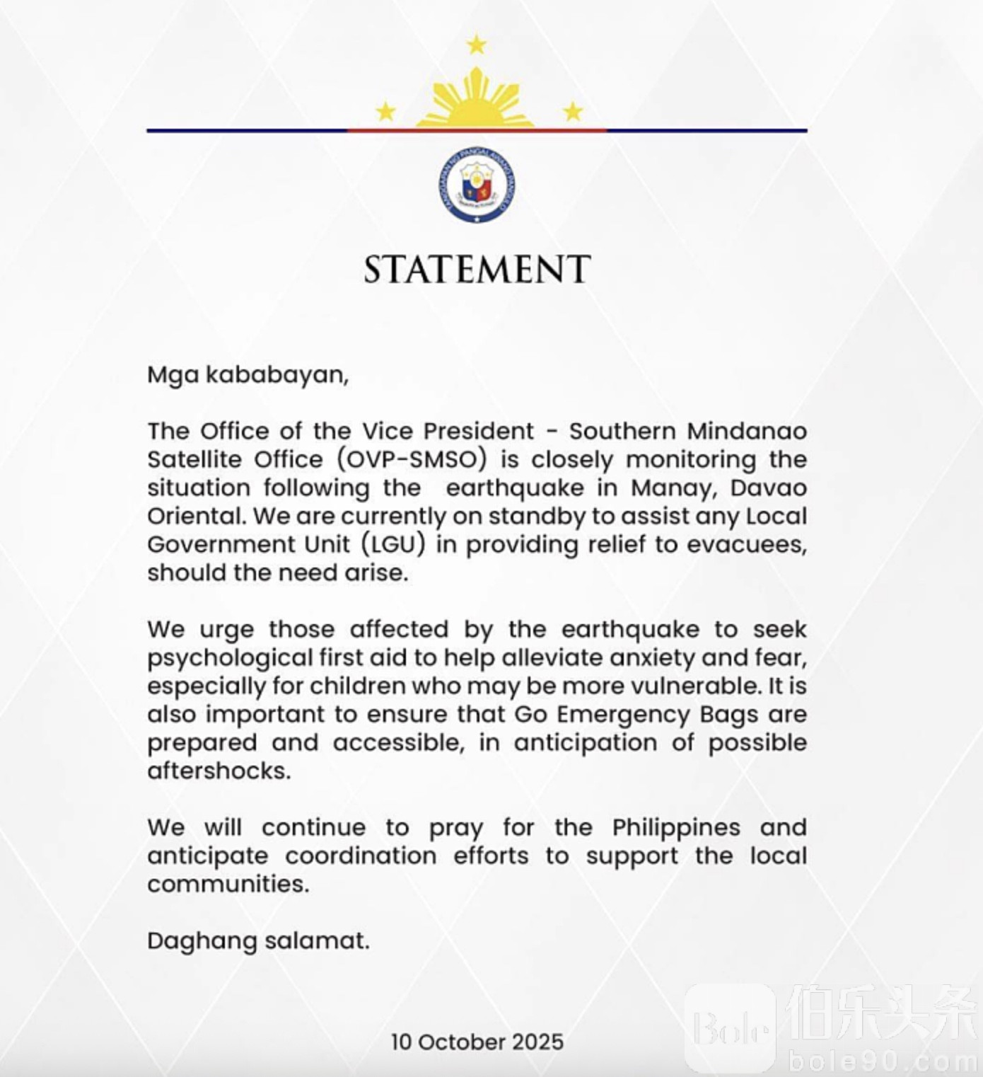 伯乐头条专讯:10月10日早上9时43分,东达沃省马奈镇(Manay, Davao Oriental)外海发生规模7.4级地震,强烈震感波及达沃、宿务及多地。官方通报称,地震已造成2人死亡、多人受伤,多地停电、航班临时改降。菲律宾火山暨地震研究所(Phivolcs)虽已解除海啸警报,但提醒民众警惕6级以上强烈余震
