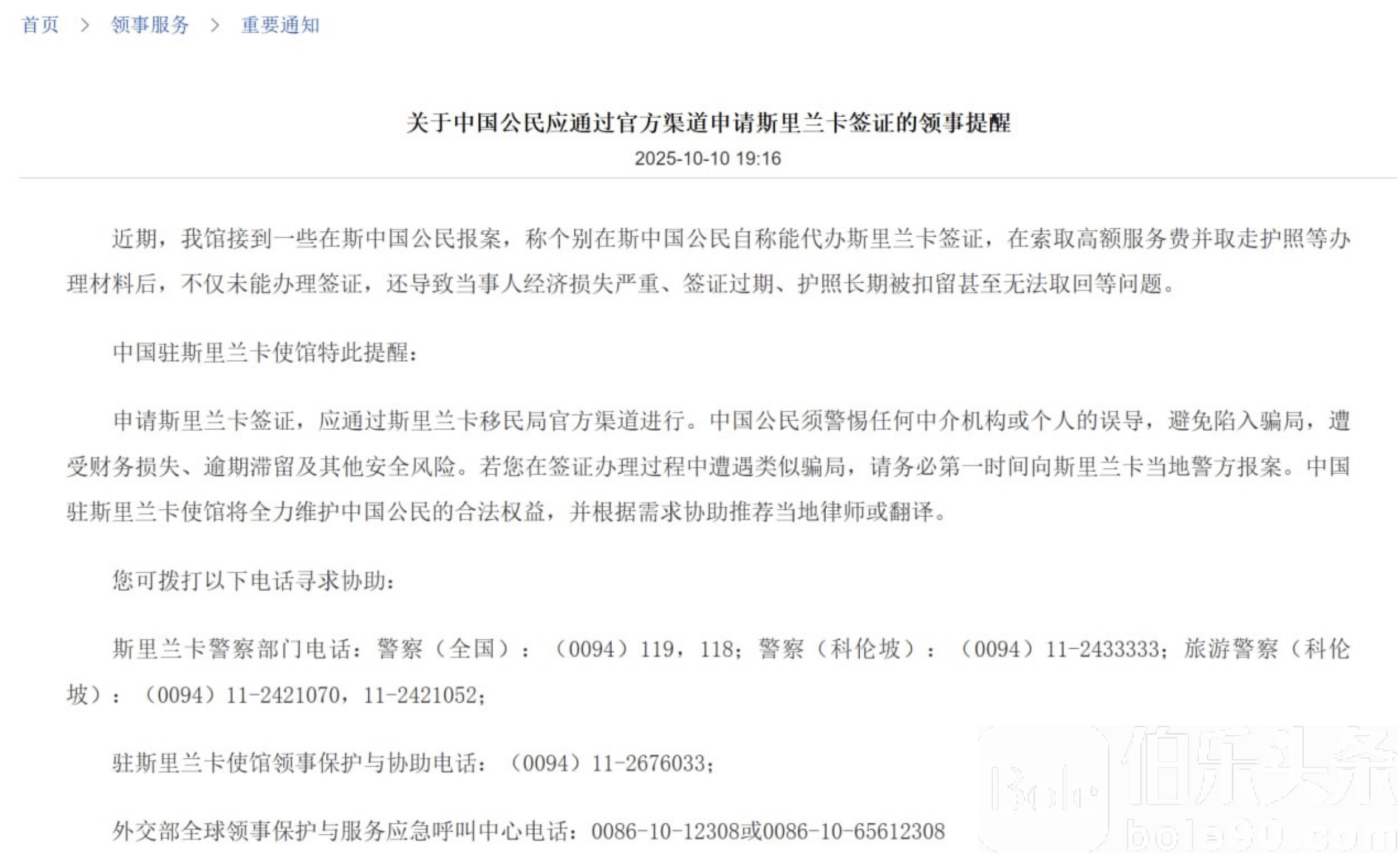 伯乐头条专讯:近日,中国驻斯里兰卡大使馆发布最新领事提醒,呼吁在斯中国公民警惕所谓“签证代办”陷阱,务必通过官方渠道办理签证,以免遭受经济和人身损失。