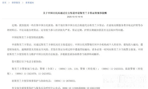 使馆强调,斯里兰卡签证应通过斯里兰卡移民局官方网站正规官方途径申请,不应轻信任何个人或中介的“包办”“加急”“内部渠道”等虚假承诺。