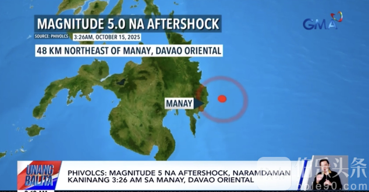 伯乐头条专讯:菲律宾南部再度传出强震!菲律宾火山暨地震研究所(PHIVOLCS)15日凌晨通报,达沃东方省(Davao Oriental)马奈(Manay)外海于凌晨3时26分发生5.0级地震,震源深度仅12公里,属构造型地震,震感强烈,沿海居民惊慌逃出家门。