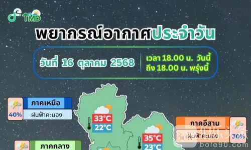 曼谷及周边地区同样预计零星雷阵雨,夜间气温24至25摄氏度,白天最高34至35摄氏度,东南风10至20公里每小时。