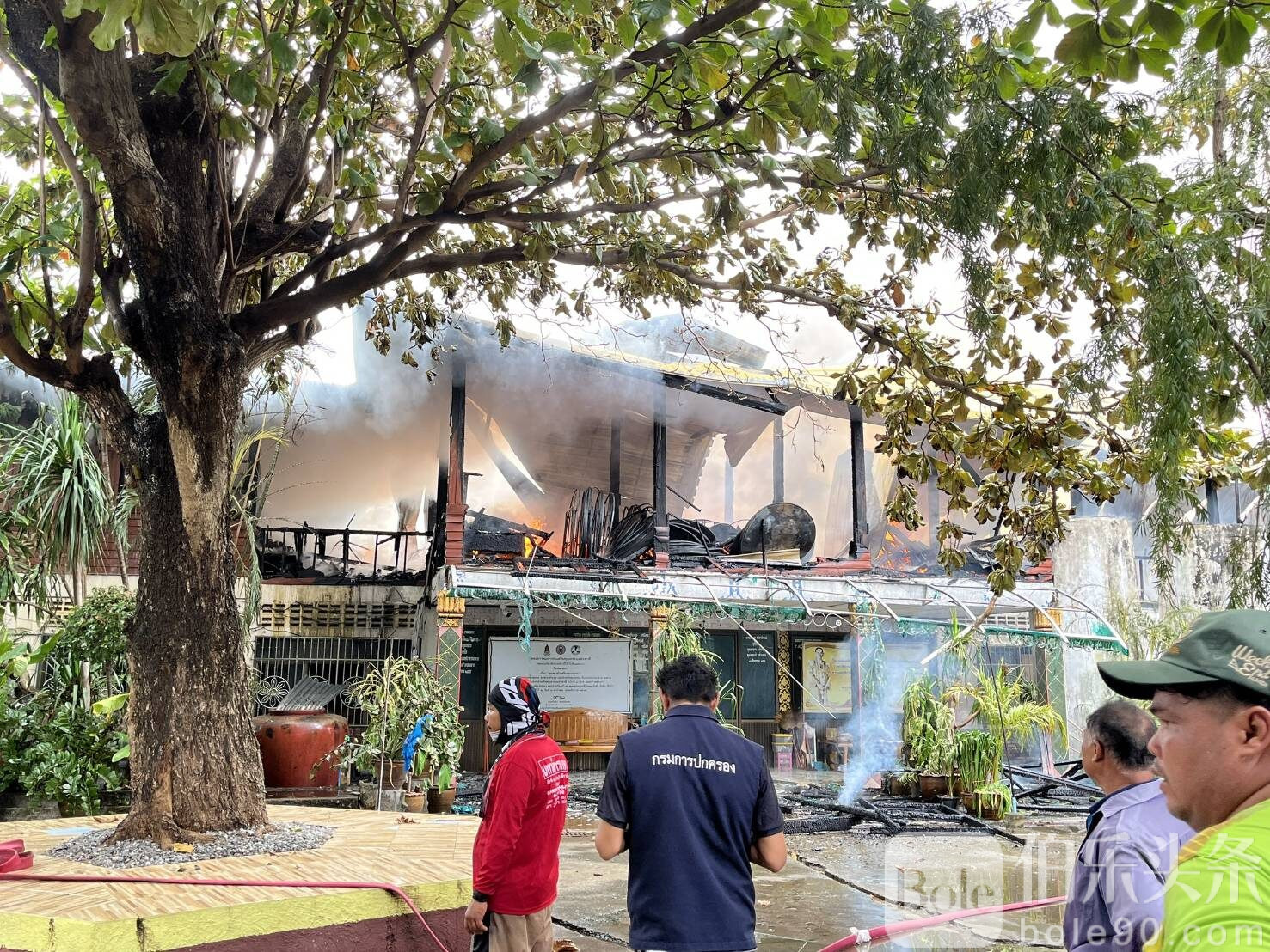 伯乐头条专讯:泰国呵叻府(Nakhon Ratchasima)一座拥有百年历史的古寺,17日中午突发严重火灾,整栋寺庙建筑在爆炸声中陷入火海,火势凶猛,僧侣与小沙弥惊慌逃生,现场一度混乱。目前暂无人员伤亡报告,但整座佛堂与多件珍贵古物被烧成灰烬,损失惨重。