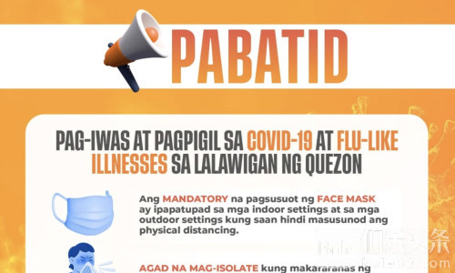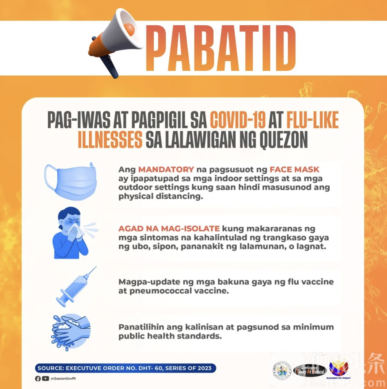 伯乐头条专讯:菲律宾奎松省(Quezon)近日正式发布行政命令,宣布重新实施强制口罩措施。根据最新规定,所有民众在室内场所无法保持社交距离的户外区域都必须佩戴口罩,以防止新冠病毒及流感病毒的扩散。