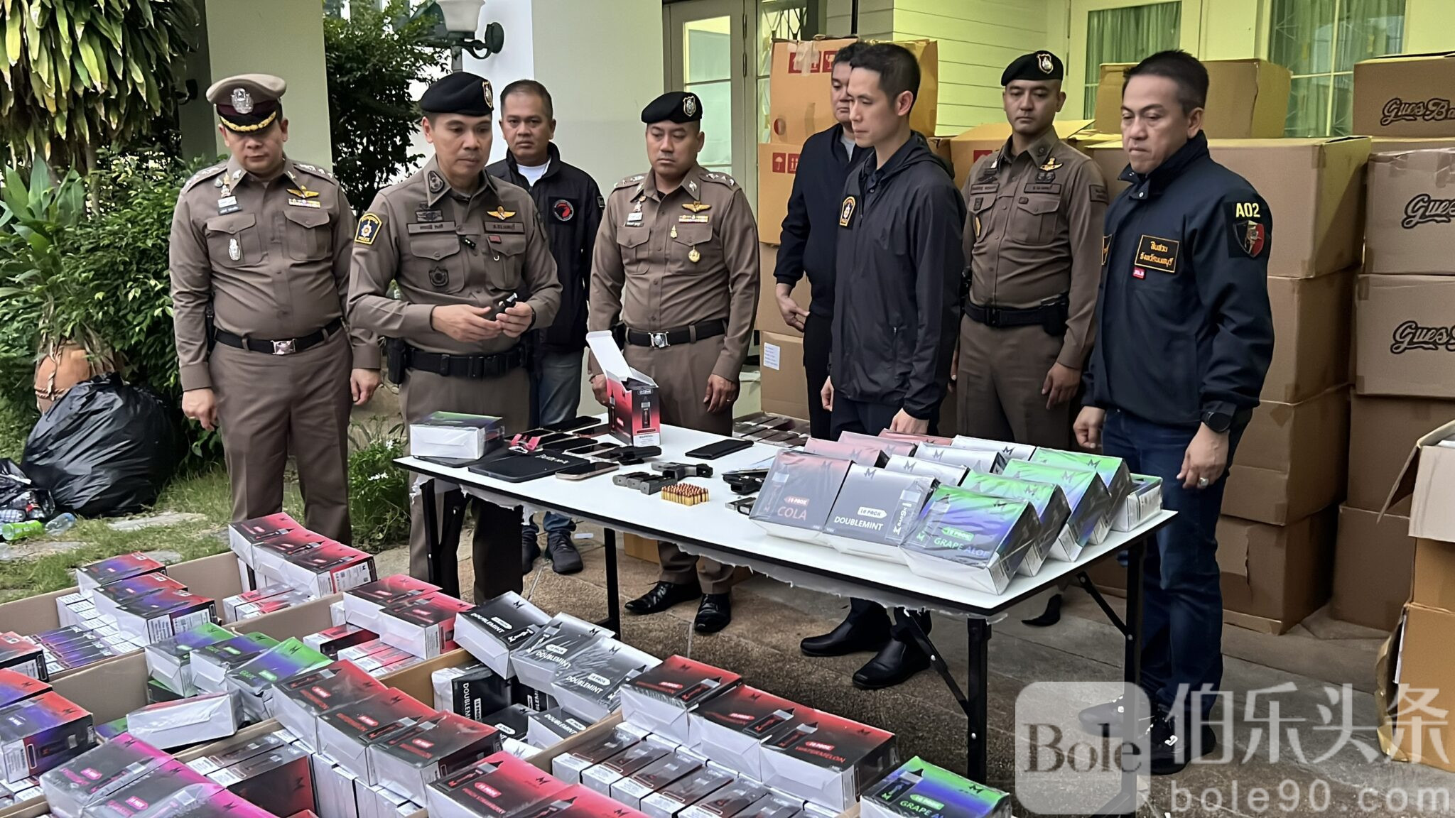 伯乐头条专讯:泰国暖武里警方重拳出击,成功捣毁一个大型电子烟仓库,现场查获超过 8 万件电子烟产品及多件枪械,总价值高达 2400 万泰铢!警方行动由暖武里府警察局局长德察披·空迪少将(Pol. Maj. Gen. Dechrapee Khongdee)亲自带队执行,震动全城。