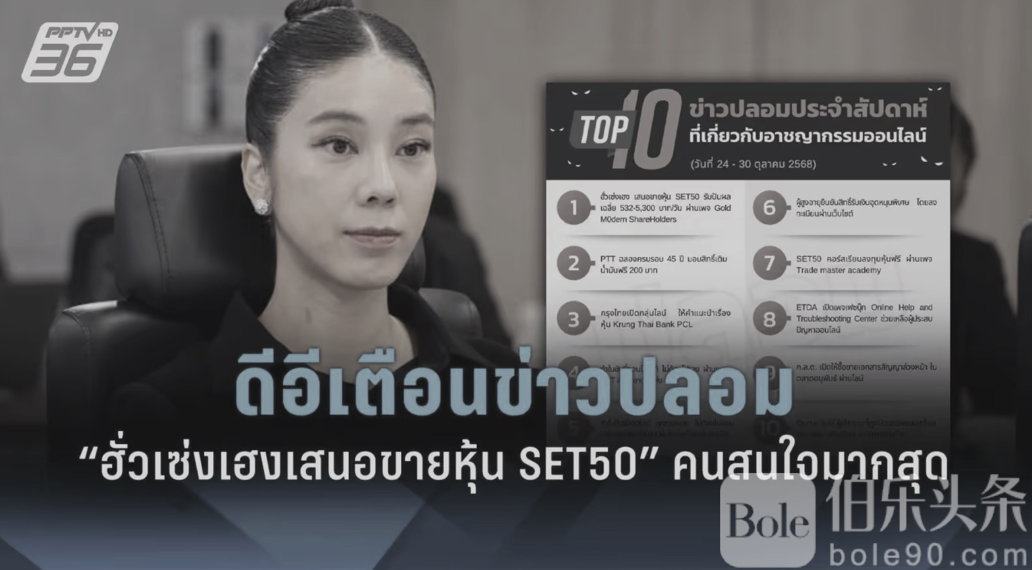 伯乐头条专讯:泰国数字经济与社会部下属反假新闻中心(AFNC)于11月2日对外公布最新监测结果,点名民众最常遇到的“十大网络犯罪假新闻”,并提醒公众提高警觉,尤其当心以“高回报”“官方福利”“线上办证”为诱饵的虚假信息。10月24日至30日一周内,AFNC共接获近101万条信息需筛查,最终列出公众最关心的10大假新闻样态,涵盖假股票分红、假政府补贴、假在线办证、伪装成官方机构的虚假投资课程等。