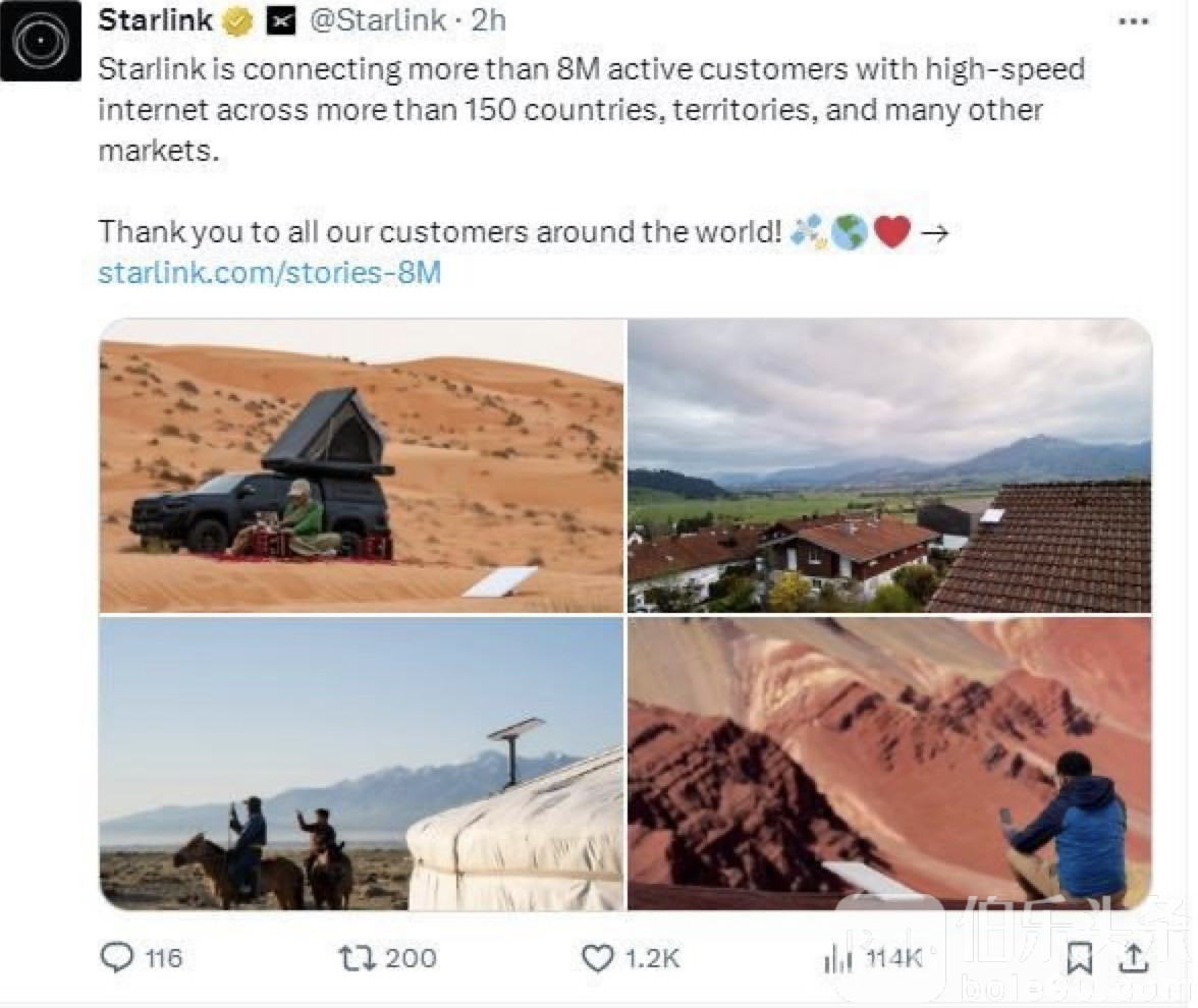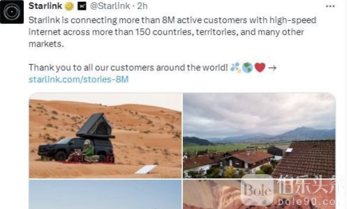 伯乐头条专讯:马斯克的卫星互联网项目“星链”(Starlink)再次传来重磅消息——全球用户数量已突破 800 万,服务覆盖超过 150 个国家和地区,成为全球增长最快的卫星网络之一。