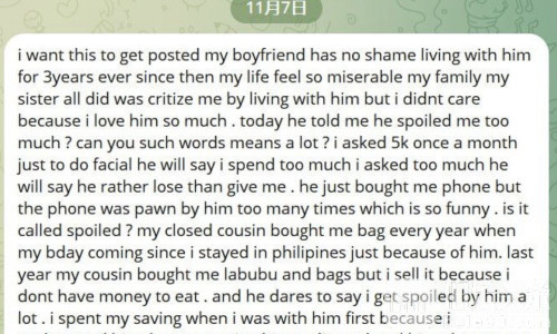 伯乐头条专讯:一名在菲律宾的女子近日向网络投稿,控诉与其中国籍男友共同生活三年来,自己的人生几乎被毁。她表示,家人和妹妹一直批评她与男友同居,但她当时不在乎,因为深爱对方。然而,三年的生活中,她却遭遇了极度不公平的待遇。