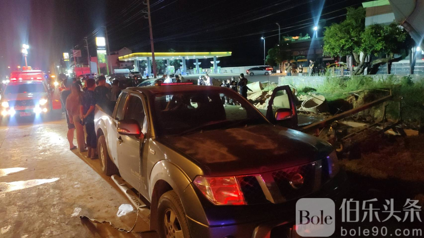 附近一辆Honda摩托车(车牌号:1 กส 6897)倒地,驾驶人重伤送医。路边停放的Nissan皮卡属于道路施工队,其车尾被撞,造成1名男性工人死亡,另4名工人受伤,均已送医院治疗。