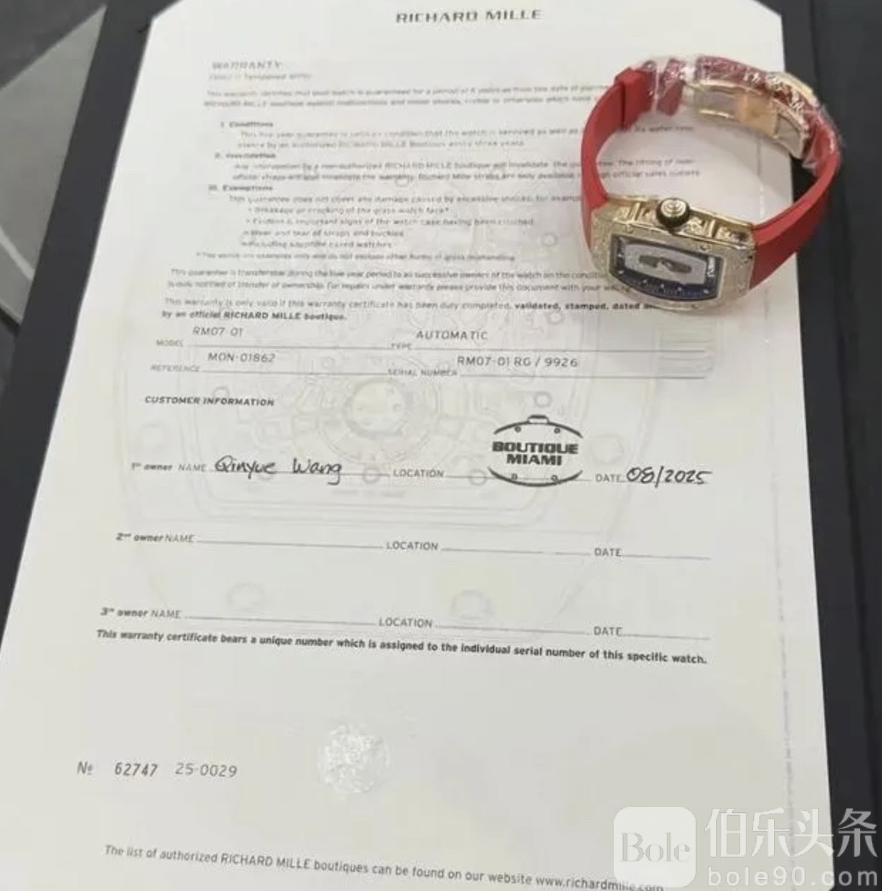 博主透露,手镯是半个月前在柬埔寨以12万美元购得,手表则是价值260万港币的镶钻理查德米勒,仅在香港购买一个多月。事件发生后,她已在中国报警,并调取北京机场相关监控,但未发现异常。