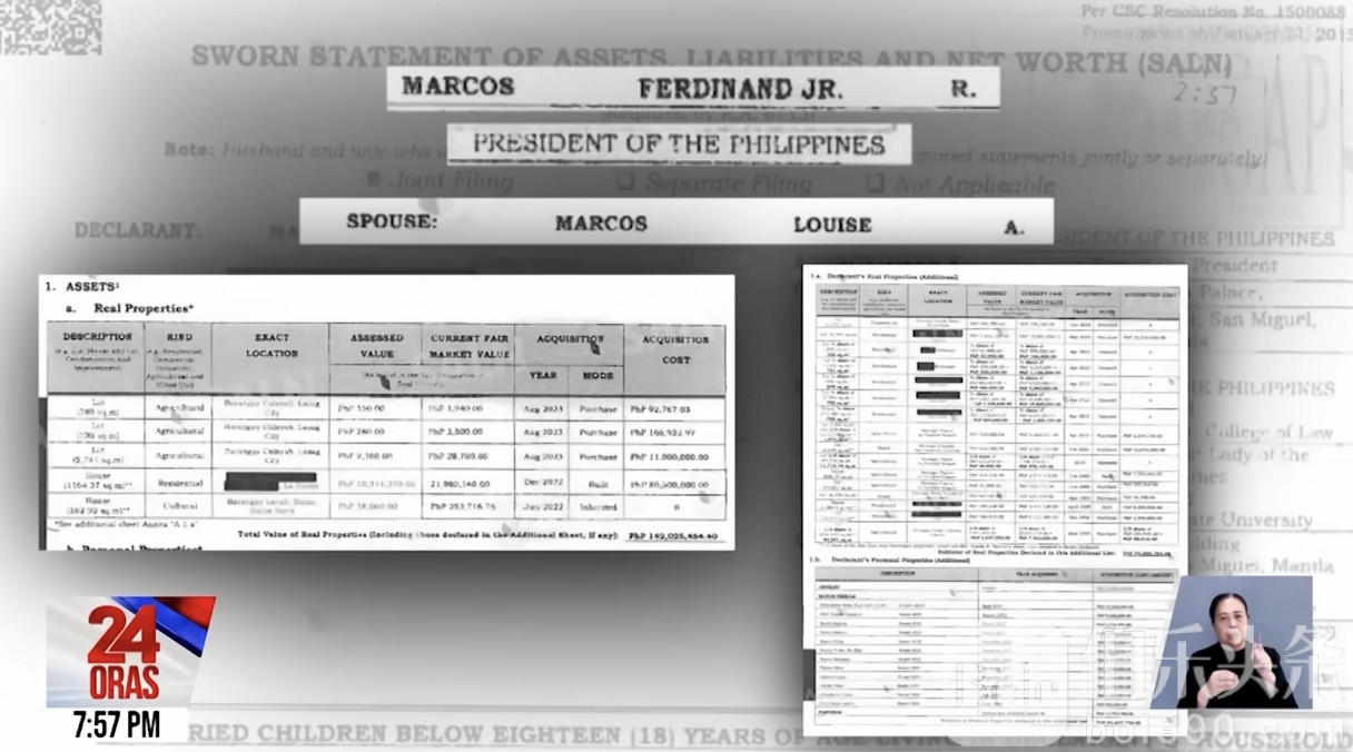 马科斯2024年SALN未申报任何负债,他此前自2022年6月上任以来的SALN显示,净资产稳步增长。2022年6月30日上任时净值为3.29亿披索,估值约9.08亿披索;2022年底净值为3.71亿披索,估值9.607亿披索;2023年底净值为3.81亿披索,估值11.57亿披索。2024年净资产与估值的持续增长反映了马科斯夫妇资产规模的稳步扩张。