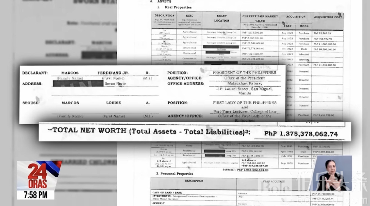 伯乐头条专讯:菲律宾副总统萨拉(Sara Duterte)最新财产申报显示,截至2024年12月31日,其个人及家庭净资产已升至约8,851万披索,自2022年6月上任副总统以来,资产增加约1,745万披索。根据GMA Integrated News获取的财产、负债及净值申报(SALN)文件,副总统与丈夫马纳塞斯·卡尔皮奥(Manases Carpio)及子女共有房地产价值约6,680万披索,包括住宅及土地;个人财产如车辆及其他物品则约3,165万披索。