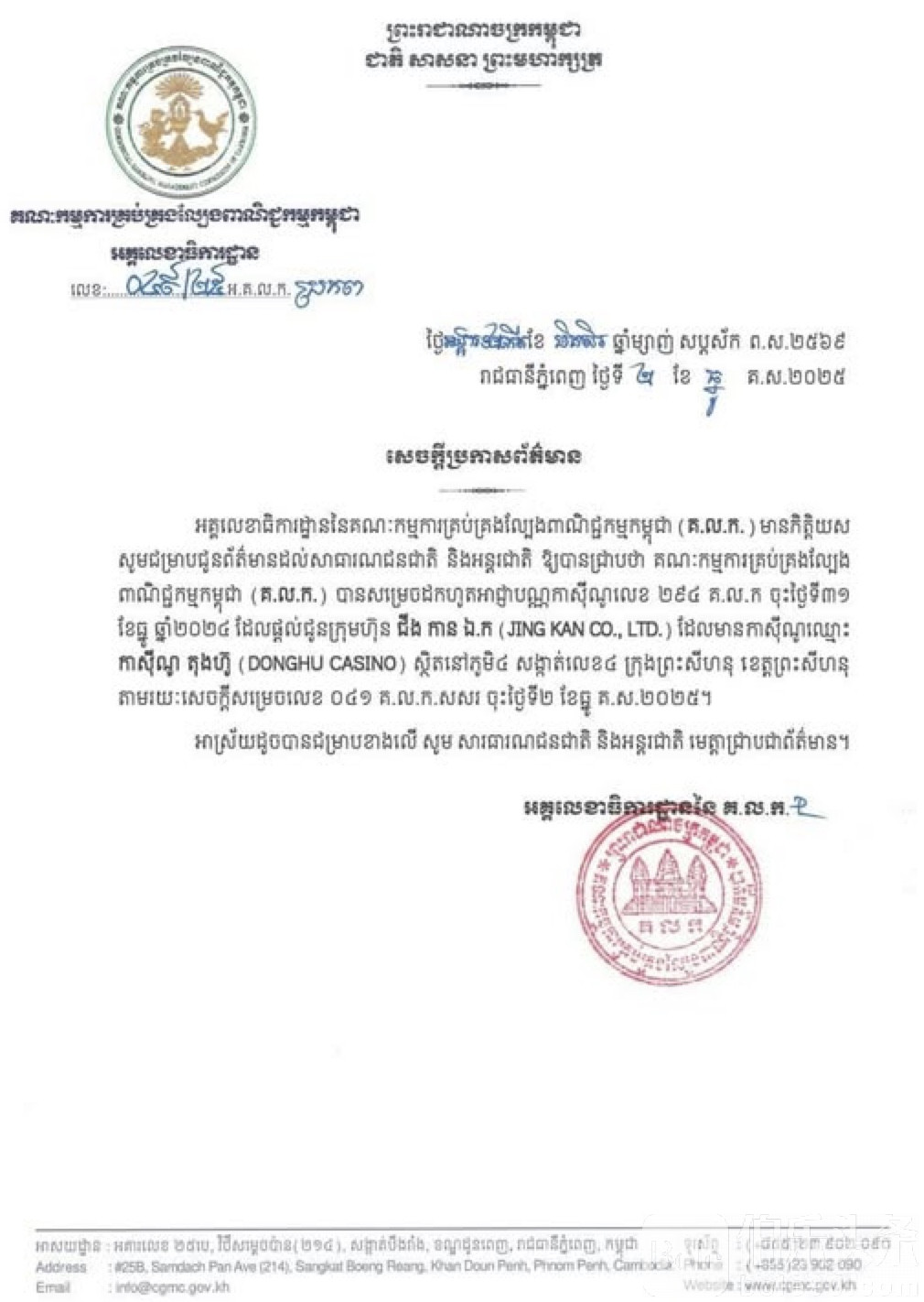 伯乐头条专讯:12月2日,柬埔寨商业赌博管理委员会正式发布公告,宣布吊销由JING KAN CO., LTD持有的赌场经营许可证(编号294 C.C.C),该许可证原授权其在西港运营“东湖赌场”(DONGHU CASINO)。