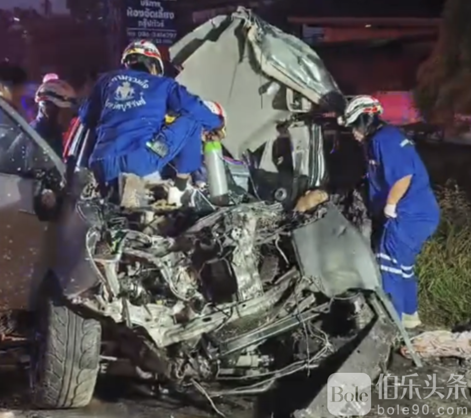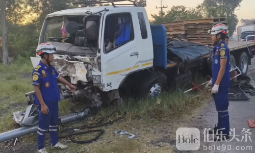 伯乐头条专讯:泰国武里南府3日清晨发生一起惨烈车祸,一辆皮卡疑高速行驶时突然与对向拖车迎面相撞,造成车头全毁、车顶被震开,副驾驶男子当场身亡,21岁女司机重伤被困,现场惨不忍睹。