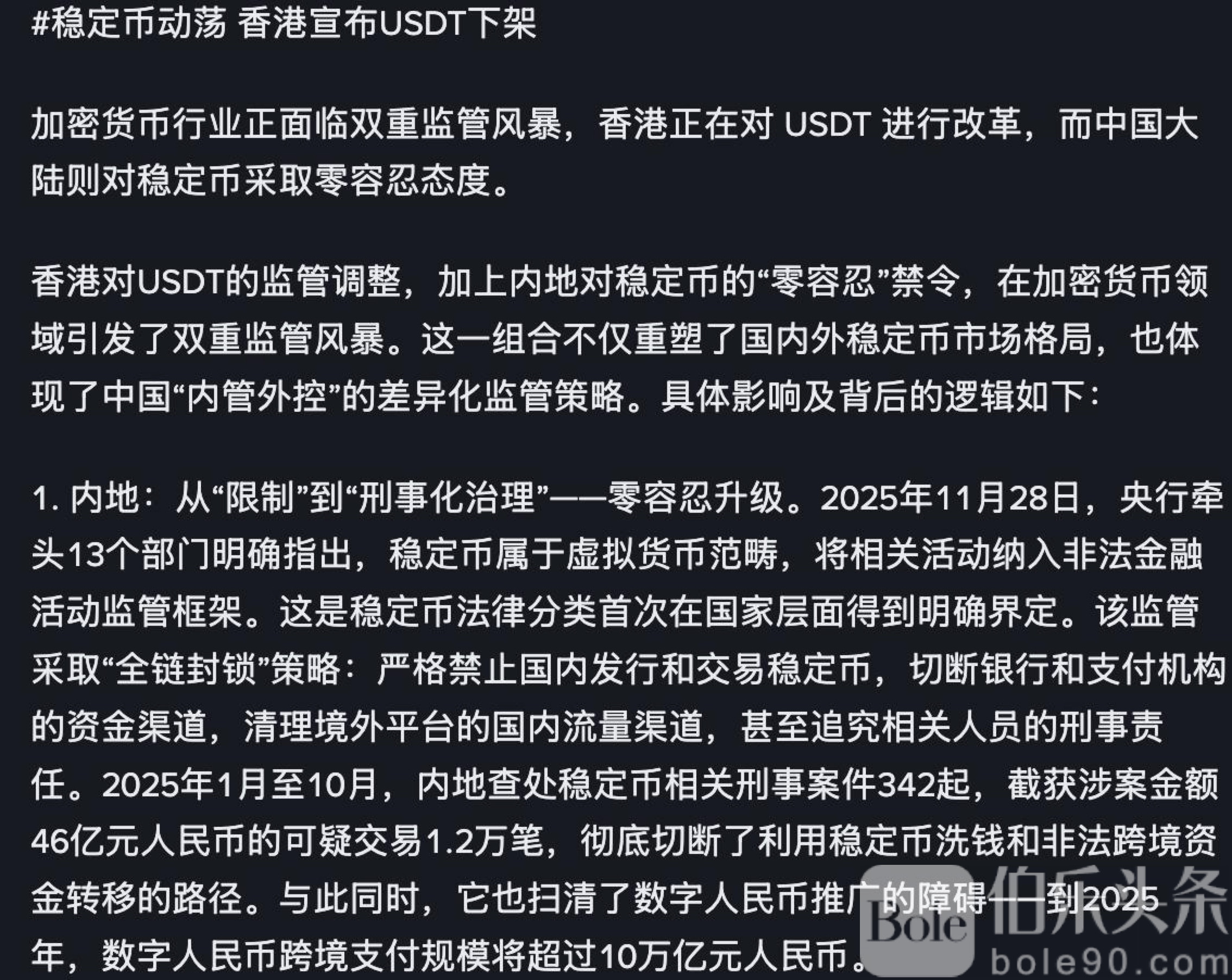 伯乐头条专讯:加密货币圈这两天可以说是“天亮前那阵风最冷的时刻”。随着香港正式宣布平台必须下架无牌稳定币、内地同步将 USDT 相关交易纳入刑事治理,全球流通量最大的稳定币正面临前所未有的双重监管夹击。业内不少人直呼:废了废了。