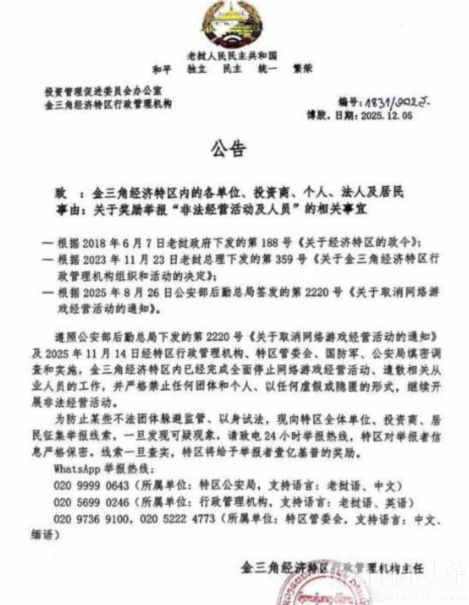 伯乐头条专讯:金三角经济特区这两天亮出了一张“重拳整治的新牌面”。特区管理机构联合公安、军方发布最新公告:凡是举报非法经营活动、违法人员线索并查实的,最高可获得一亿基普奖励。力度之大,让不少在地居民直呼“这是来真的”。