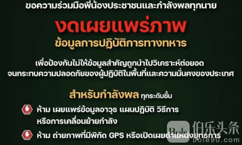 伯乐头条专讯:泰国第二军区 12 月 8 日发布紧急通告,呼吁公众与全体军人立即停止拍摄、分享任何与泰柬边境军事行动相关的照片、影片或带有定位信息的画面,以免被对方利用,影响前线作战安全。