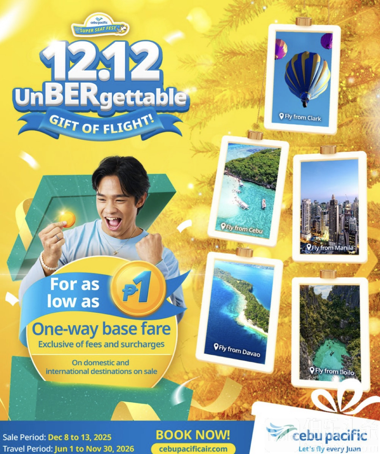伯乐头条专讯:宿务太平洋航空今年压轴的「12.12 Piso Sale」悄悄一上线,就让不少准备明年出游的旅客瞬间坐不住了——毕竟单程最低只要 1 比索的票价,放在任何一年都堪称“狠活”。这场被视为宿务太平洋 2025 年最后一次大规模票价跳水的促销活动,现在已经正式开卖,窗口一开就是要你把 2026 的旅行日程提前堵个满满当当。
