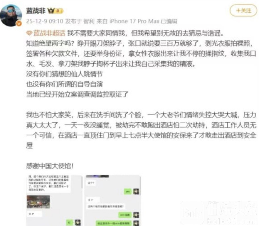 房门突然被打开,一个中国人带着两个黑人闯进房间,手里还亮着刀锋,话不多——一上来就把刀抵在脖子上,开口要300万。那一瞬间,蓝战非意识到:这不是临时起意的抢劫,而是一场蓄谋已久的“围猎”。