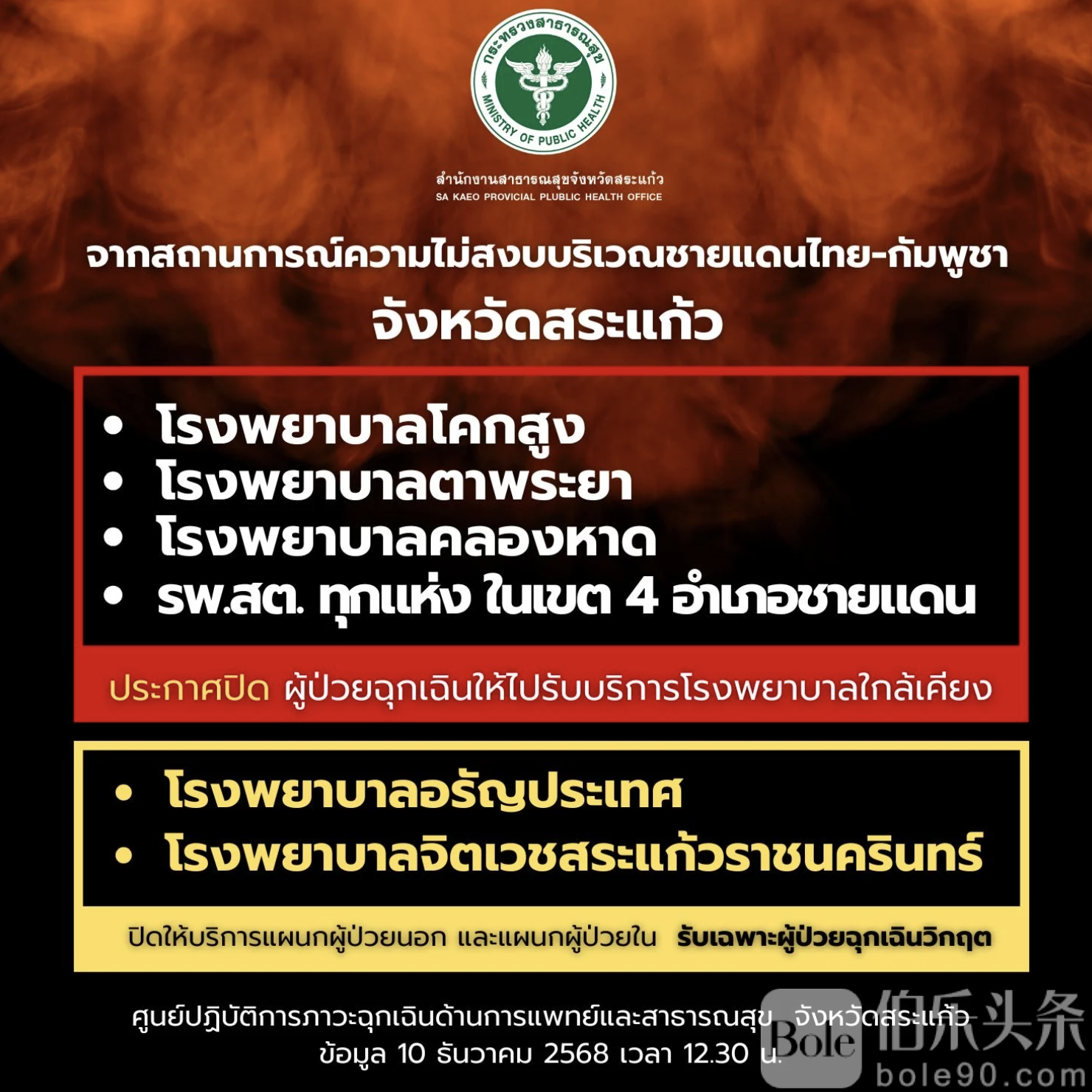 沙缴府公共卫生局局长 帕拉蓬·约实琳达医生 表示,目前三家临时关闭的医院分别为——高松医院、达帕耶医院和孔哈医院。虽然医院并未遭到直接破坏,但附近区域持续传出炮击与交火声,为确保医护人员和就医民众安全,只能先暂停服务。