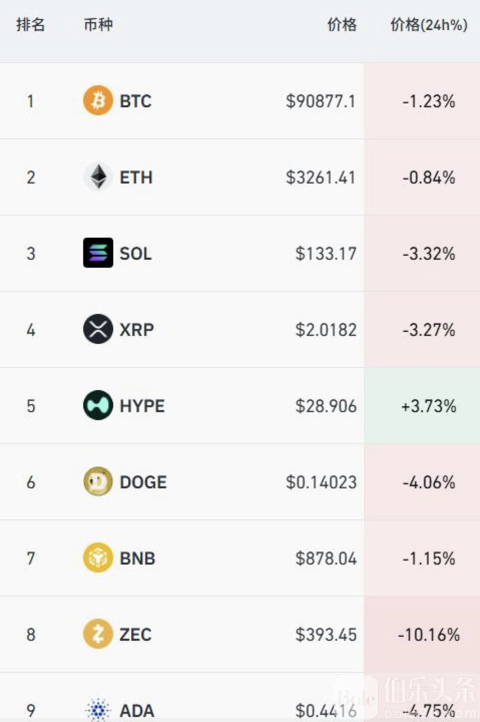 比特币最先坐不住,从9.29万美元一口气冲到9.45万美元,看起来像是要再搏一个新高。但这股劲儿只维持了几分钟,随即急转直下,价格再度跳水。截至9:37,比特币已跌至90877.1美元,跌幅1.23%。以太坊也没撑住,下挫0.84%;SOL跌幅超过3%,狗狗币更是直接跌了4%以上,几乎成了“气氛组”。