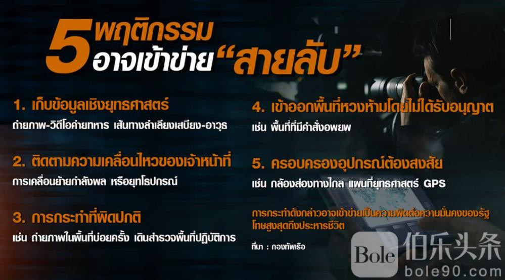 泰国皇家海军指出,近期在多地发现可疑人员窥探军事设施、拍摄敏感区域,甚至故意靠近限制地点。军方担忧有人向境外势力输送军事情报,因此公开列出五大高危行为,提醒民众务必远离“作死式操作”。