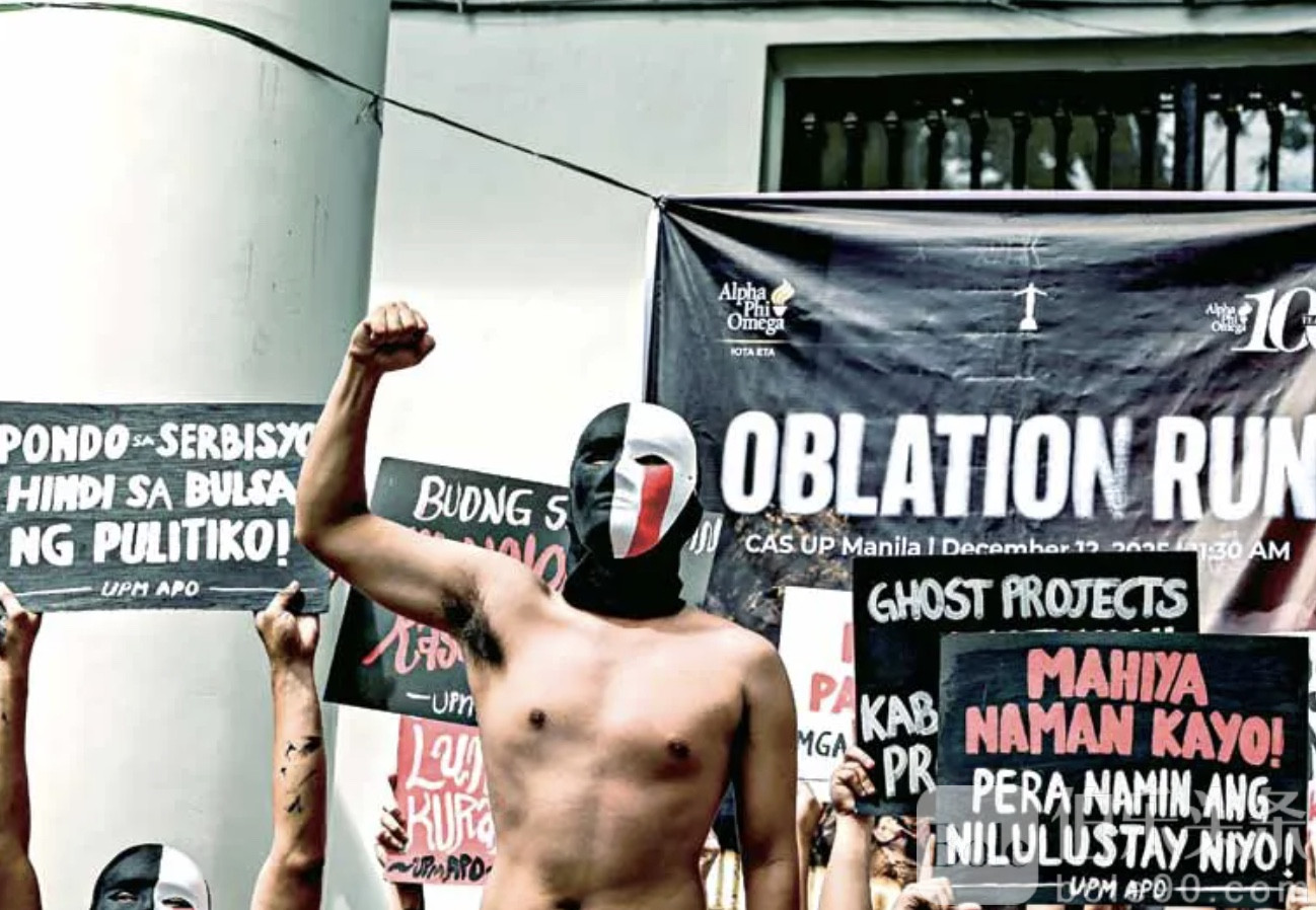 伯乐头条专讯:菲律宾国立大学(UP)马尼拉校区近日再度出现震撼一幕——约百名阿尔法菲欧米茄(APO)兄弟会成员于12月12日在校园内发起年度“裸奔传统”行动,以极具冲击力的方式,公开抗议政府贪腐、制度失灵,并为洪灾受害者发声。