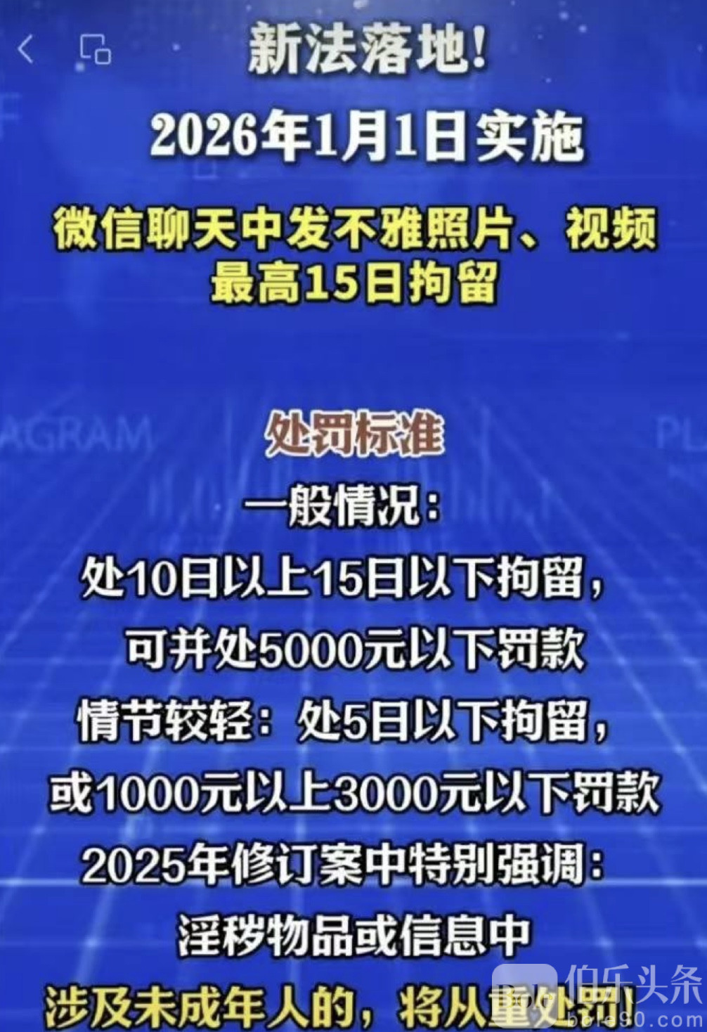 伯乐头条专讯:自2026年1月1日起,针对在微信等网络聊天工具中传播不雅照片、视频的行为,我国将实施更为明确、也更具震慑力的处罚标准。根据修订后的《治安管理处罚法》,此类行为一旦情节严重,最高可处10日以上、15日以下拘留,并处5000元以下罚款,监管尺度进一步收紧。