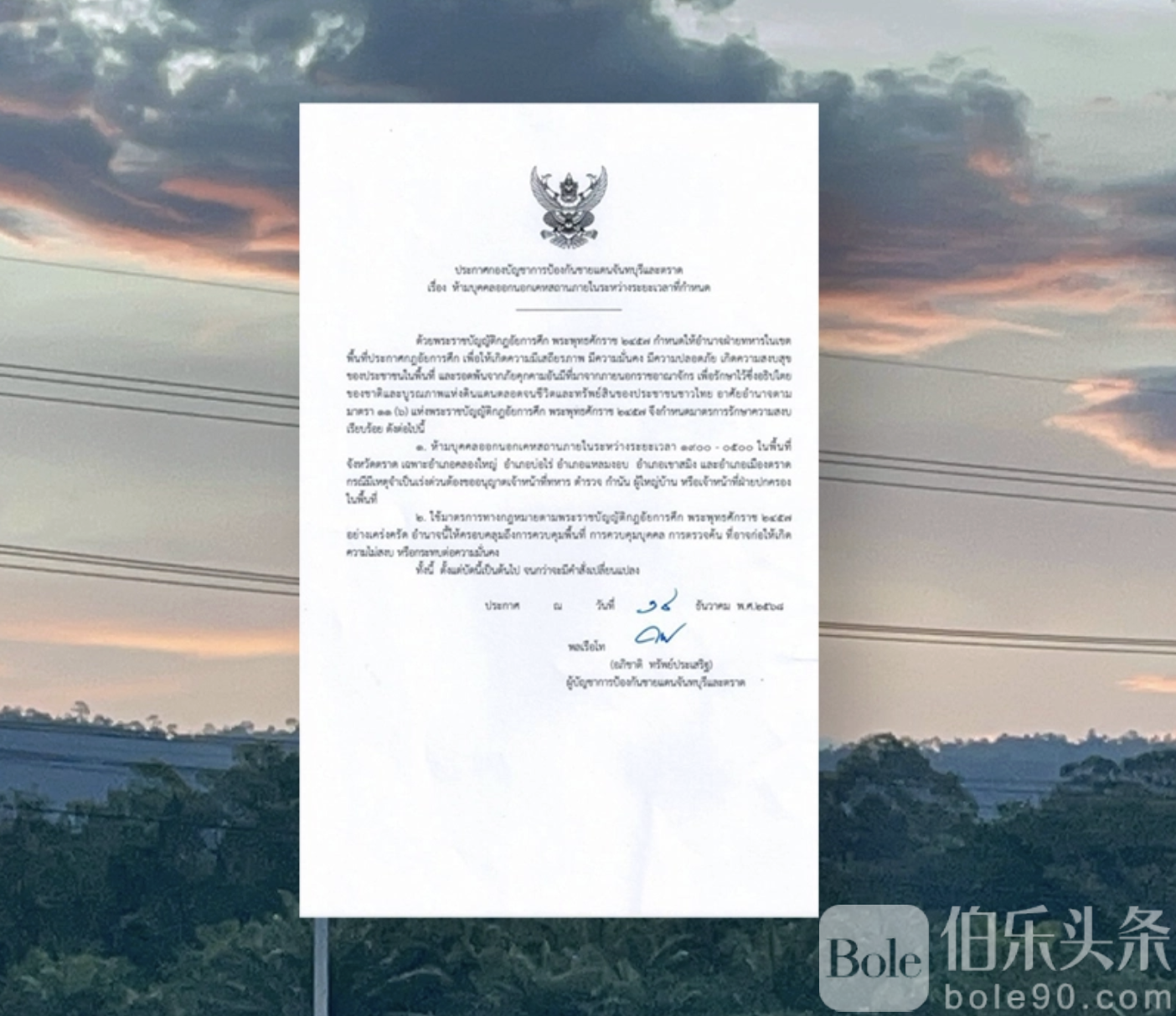 伯乐头条专讯:12月14日,泰国达叻府5个县正式进入紧急状态,并实施宵禁措施,禁止居民在晚上19点至次日凌晨5点外出。此次紧急状态由尖竹汶府和达叻府边境保护指挥部发布,依据1914年《戒严法》,旨在维护当地安全、稳定及国家主权,防范外部威胁,并保护人民生命财产安全。