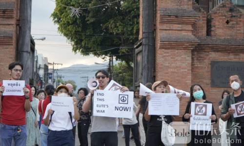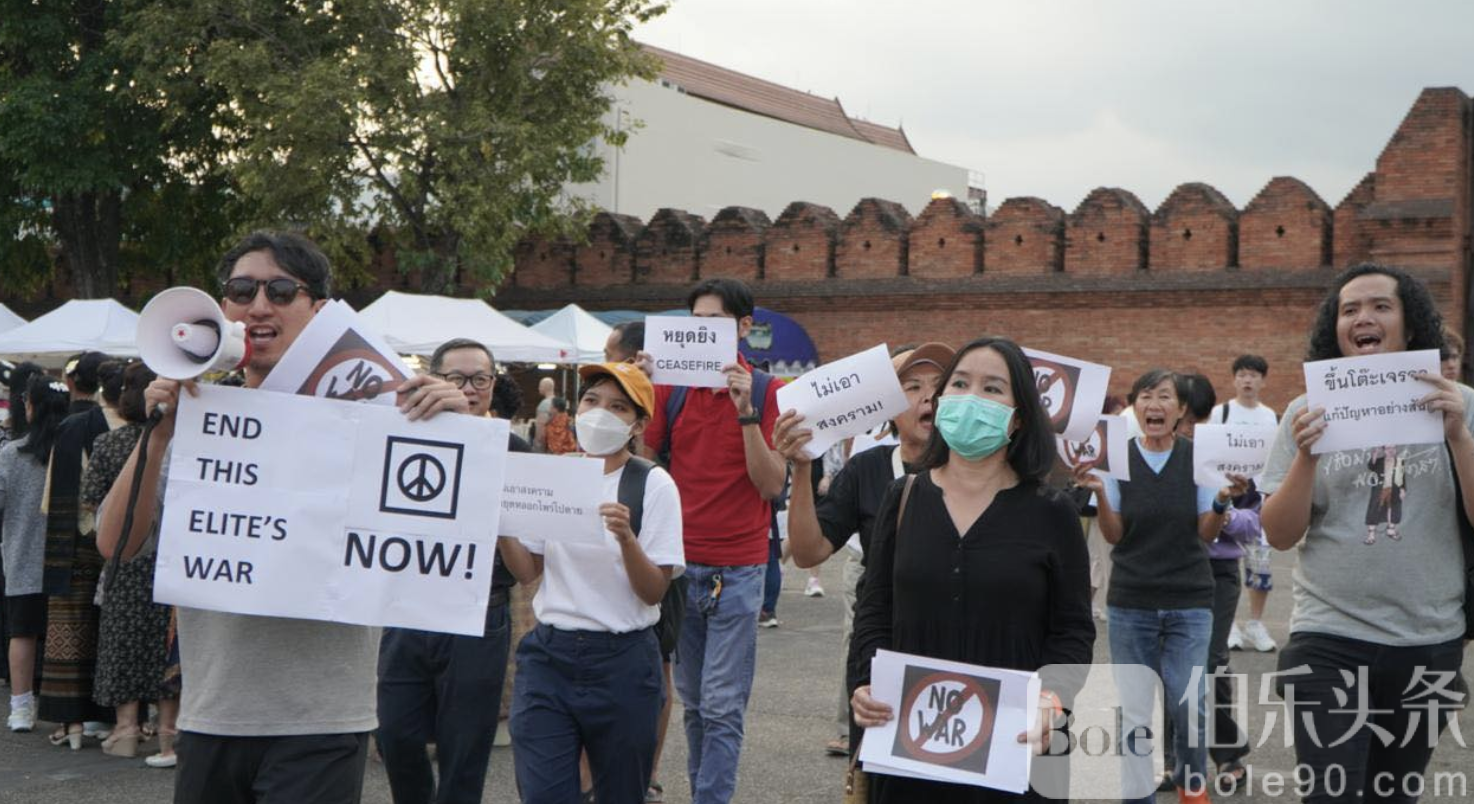 伯乐头条专讯:泰国清迈市民于2025年12月13日下午5点在市中心集会,抗议泰国与柬埔寨边境冲突升级,呼吁通过和平谈判解决问题。此次集会由当地市民自发组织,约有数百人参与,现场秩序井然,警方派出少量维持秩序人员保障安全。
