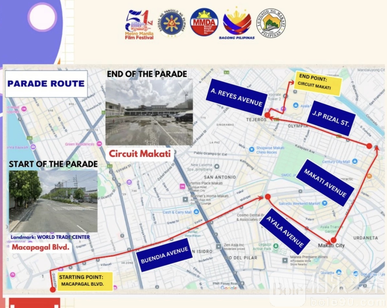 按照安排,巡游经过的路段将采取阶段性放行方式——车流会被短暂叫停,让花车队伍快速通过,随后再恢复通行。整个巡游路线全长约8.4公里,预计持续1小时40分钟,从Buendia大道出发,途经阿亚拉大道、马卡蒂大道、JP Rizal街和A. Reyes大道,终点设在Circuit Makati。
