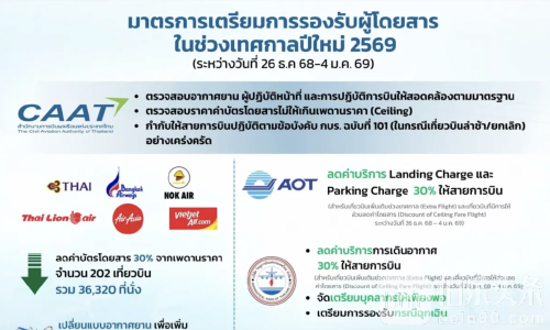 为了降低航空公司运营成本并促进票价优惠,泰国机场公司(AOT)和航空导航公司(AEROTHAI)分别将特价航班的起降费、停机费及空中服务费下调30%,保障航空公司能够顺利提供特惠航班。
