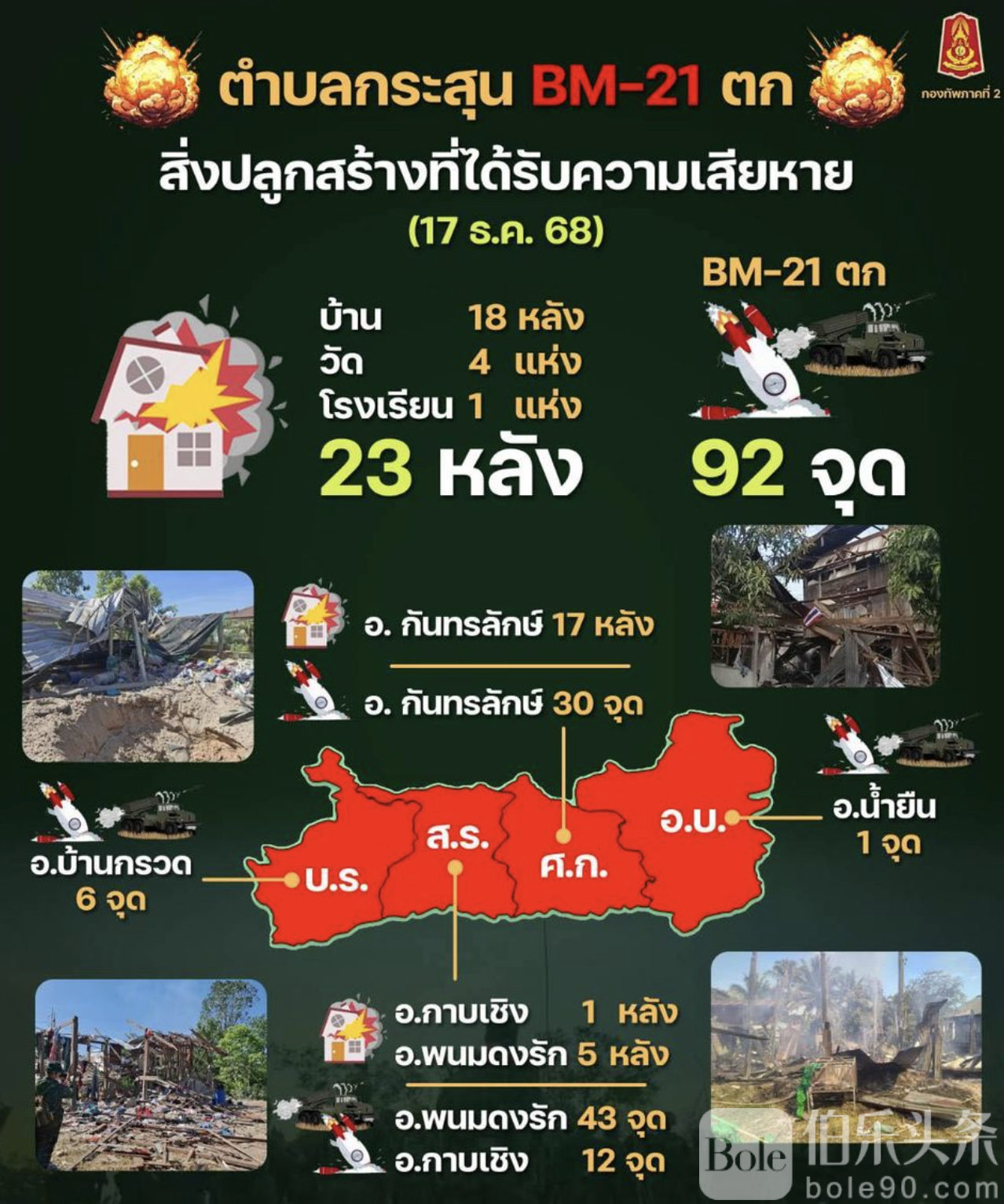伯乐头条专讯:泰国边境地区今日(12月17日)再次发生严重炮击事件,泰国第二军区表示,来自邻国的BM-21多管火箭炮弹落入泰国境内92个地点,造成房屋、寺庙及学校受损。此次事件凸显边境安全形势紧张,给当地民众生活和社会秩序带来巨大冲击。