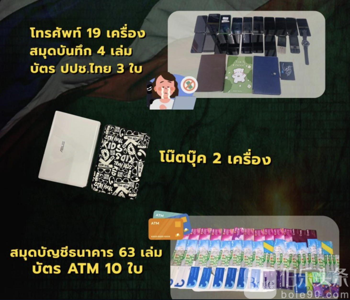 初步检查发现:现场查获手机19部、笔记本电脑2台、笔记本记录4本、银行账簿63本(均为泰国人名义)、泰国身份证3张,疑用于开设“马仔账户”,另外还查获10张ATM卡。