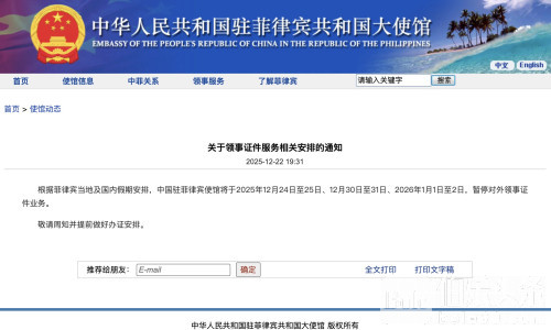 根据使馆通告,领事证件服务暂停时间包括:2025年12月24日至25日、12月30日至31日,以及2026年1月1日至2日。上述期间,使馆将不对外受理护照、旅行证、公证等各类领事证件申请。
