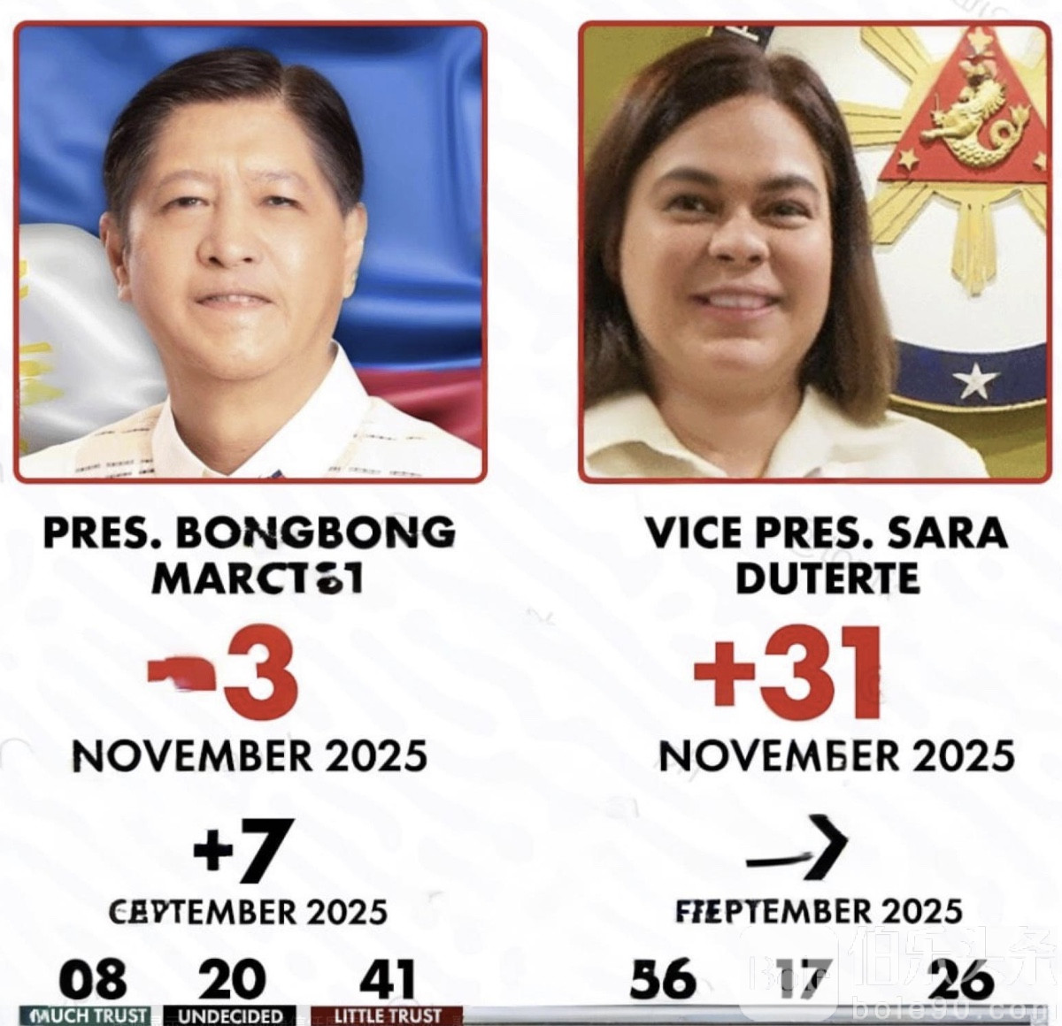 伯乐头条专讯:菲律宾社会气象站(SWS)最新民调显示,在政府正调查多起防洪工程贪腐案件的背景下,总统小费迪南德·马科斯的公众信任度持续下滑,其净信任评级已跌至-3%。相较之下,副总统萨拉·杜特尔特则呈现明显回升,净信任度升至31%,显示民众对副总统的支持度正在走高。