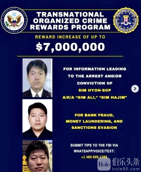 伯乐头条专讯:美国司法当局近日宣布,将悬赏金额提高至700万美元,通缉一名涉嫌为朝鲜政权在海外进行非法洗钱活动的核心人物——沈贤燮(Sim Hyon-Sop,音译)。美方指控,沈贤燮长期协助朝鲜最高领导人金正恩,通过加密货币及国际金融体系规避制裁,同时为朝鲜采购奢侈品、直升机及其他军事相关物资。