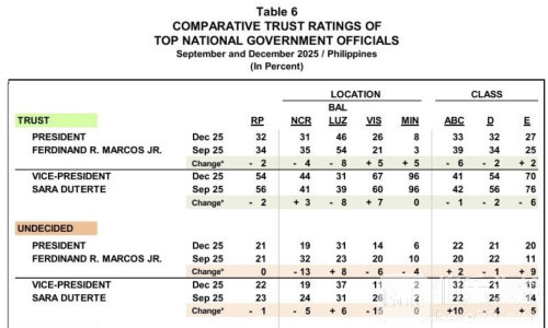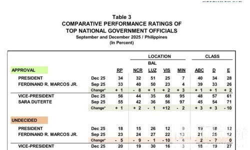 伯乐头条专讯:菲律宾最新一轮民调出炉,政坛风向再次引发热议。Pulse Asia 于12月发布的调查显示,总统小马科斯与副总统莎拉·杜特尔特的信任度在本月均出现小幅下滑,尽管幅度不大,却与当前持续发酵的反腐议题形成耐人寻味的呼应。