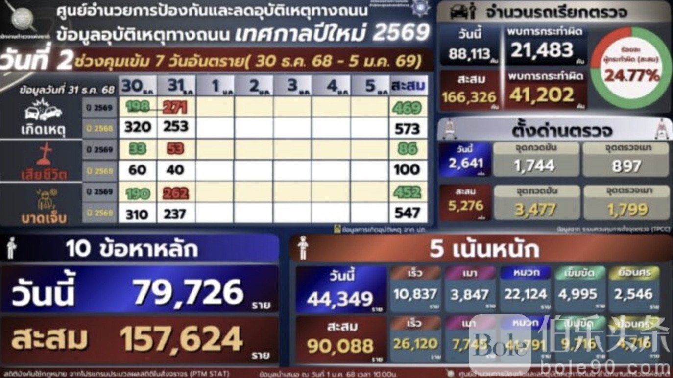 泰国国家警察署1月1日通报,在跨年交通严管行动的前两天内,警方针对10类重点交通违法行为展开高强度执法,共查处违法案件15万7624起。仅在2025年12月31日一天,就有7万9726名司机或骑行者被拦下处罚