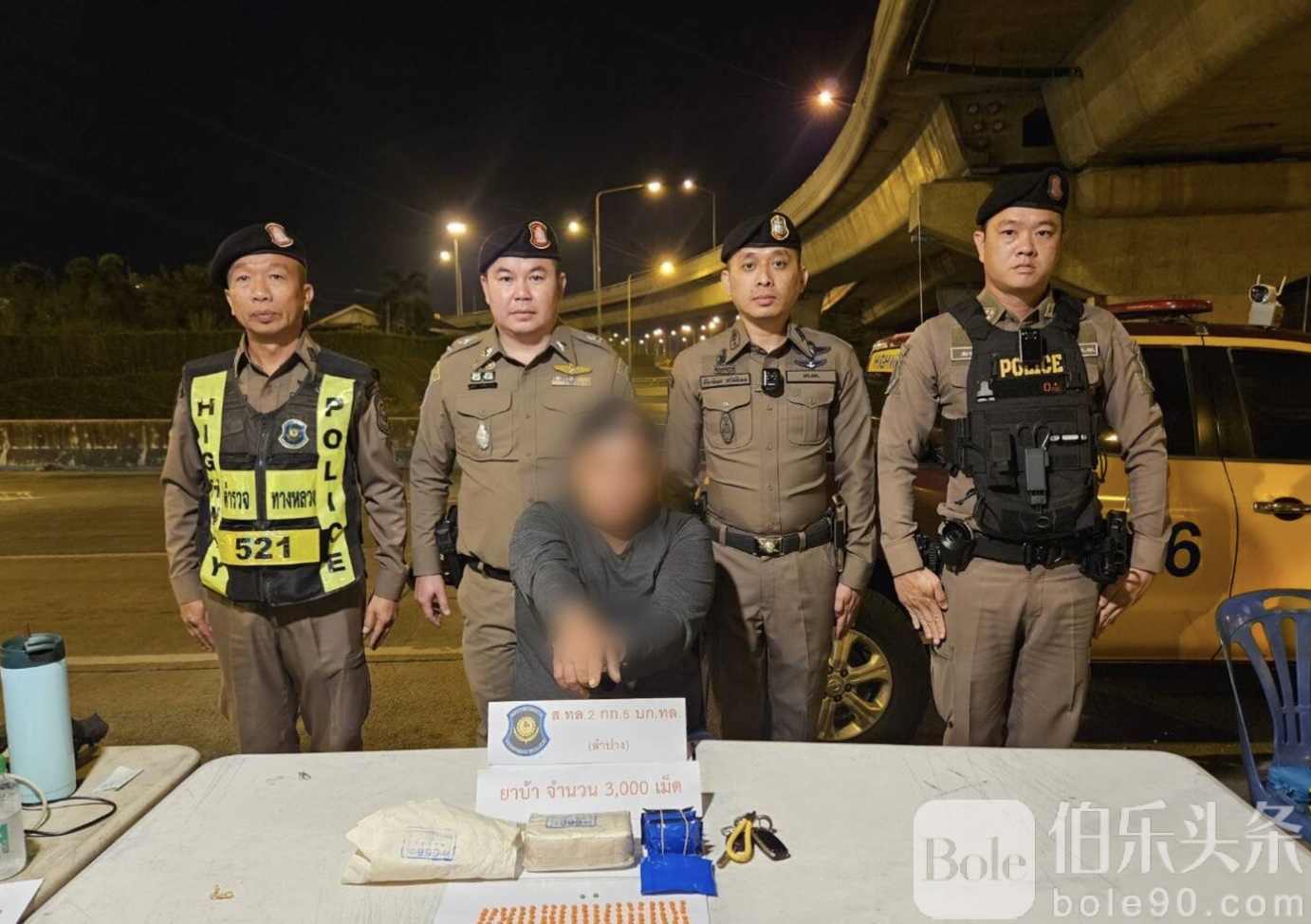 伯乐头条专讯:2026年1月3日,泰国兰拍府警方在北部高速公路年节查点时,成功抓获一名涉嫌贩卖冰毒的48岁男子,现场查获冰毒约3000颗。经调查,嫌犯承认这些毒品是他新近购买,准备在当地转售,并在车辆内自吸数颗。