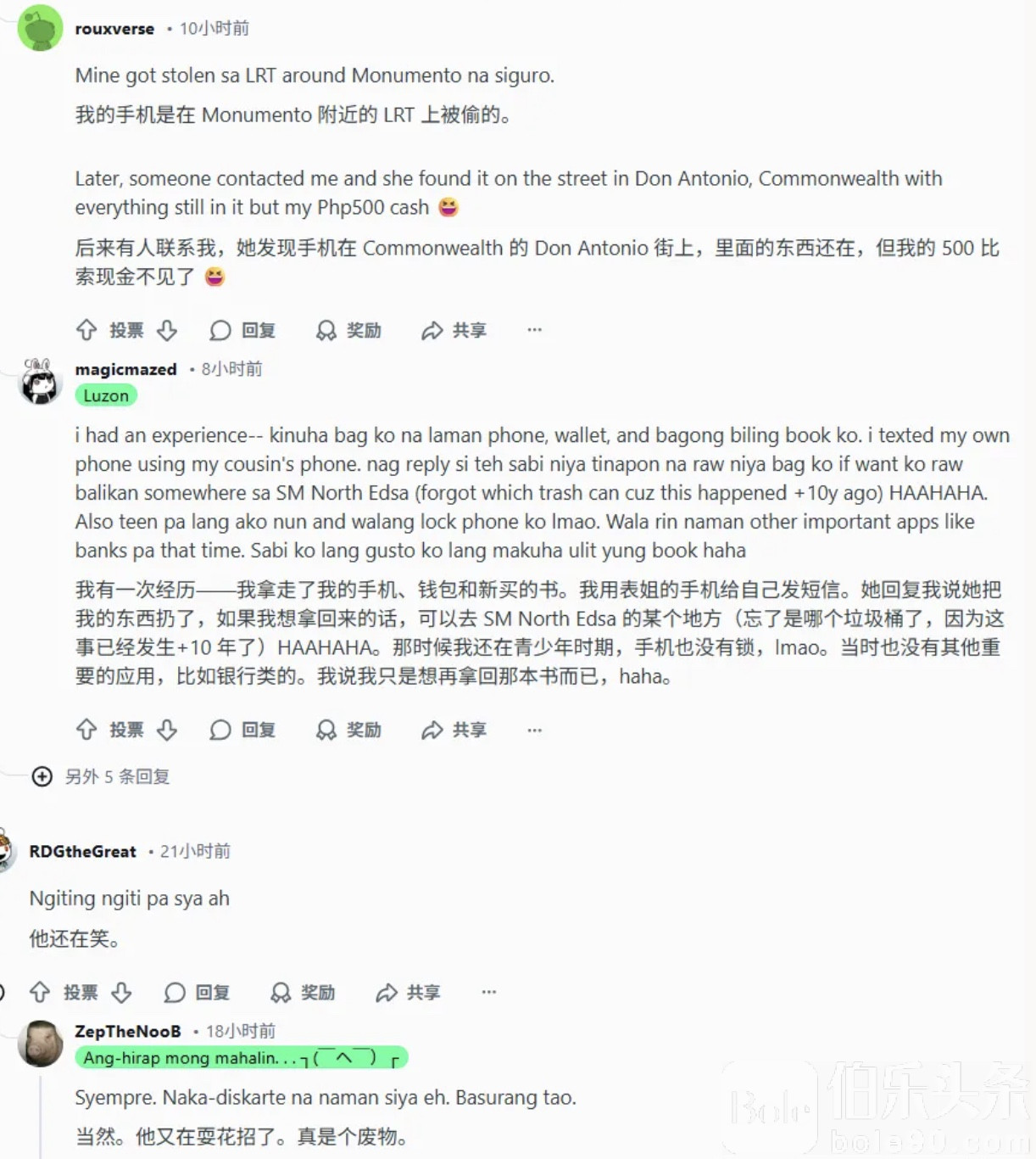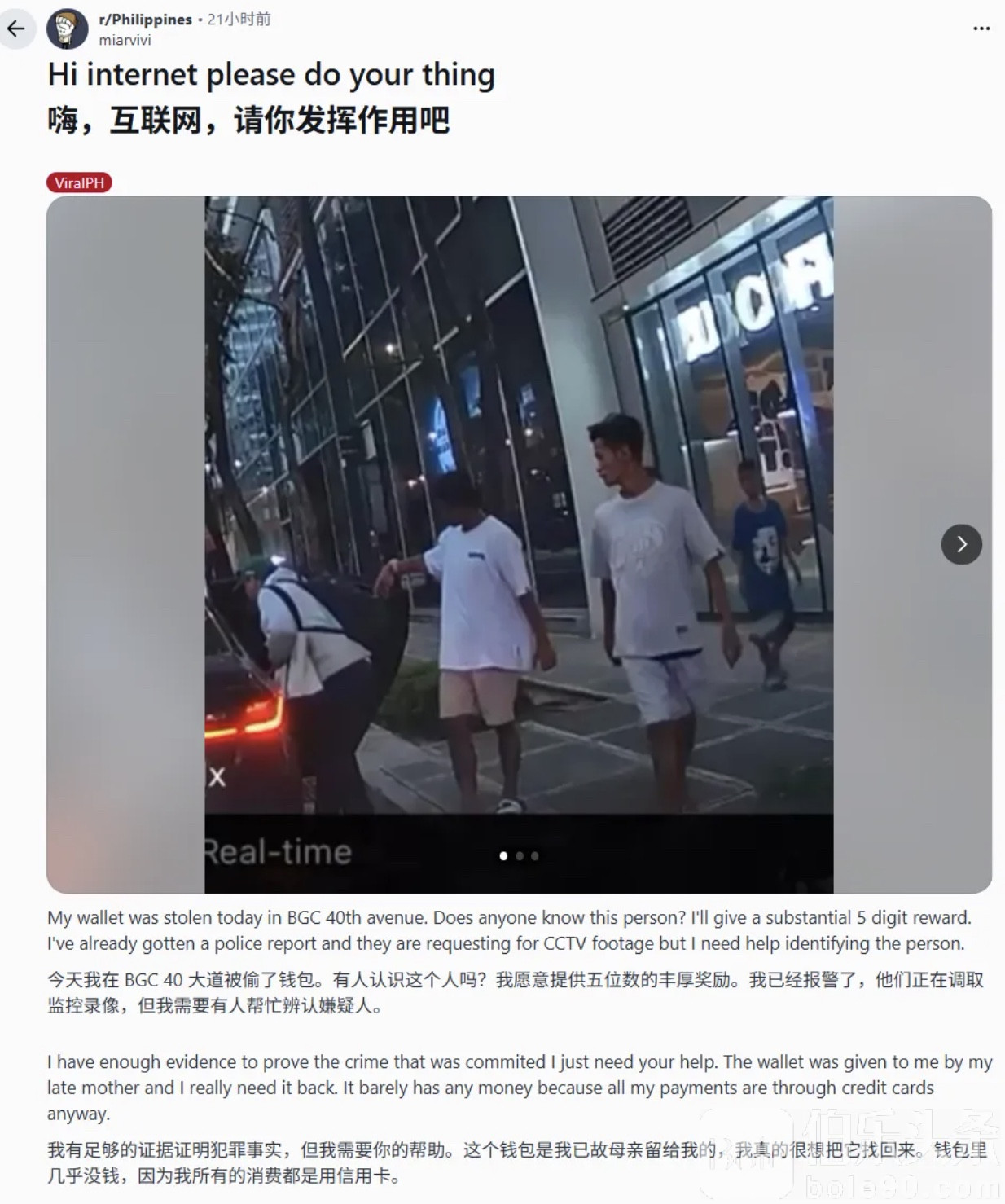 伯乐头条专讯:一桩发生在菲律宾富人区的普通盗窃案,近日却在社交平台上掀起不小波澜。一名菲律宾网民6日在Reddit的 r/Philippines 版块发帖求助,称自己在塔吉格市博尼法西奥全球城(BGC)第40街不慎被盗,钱包当街消失,而这只钱包,正是已故母亲生前送给他的遗物。