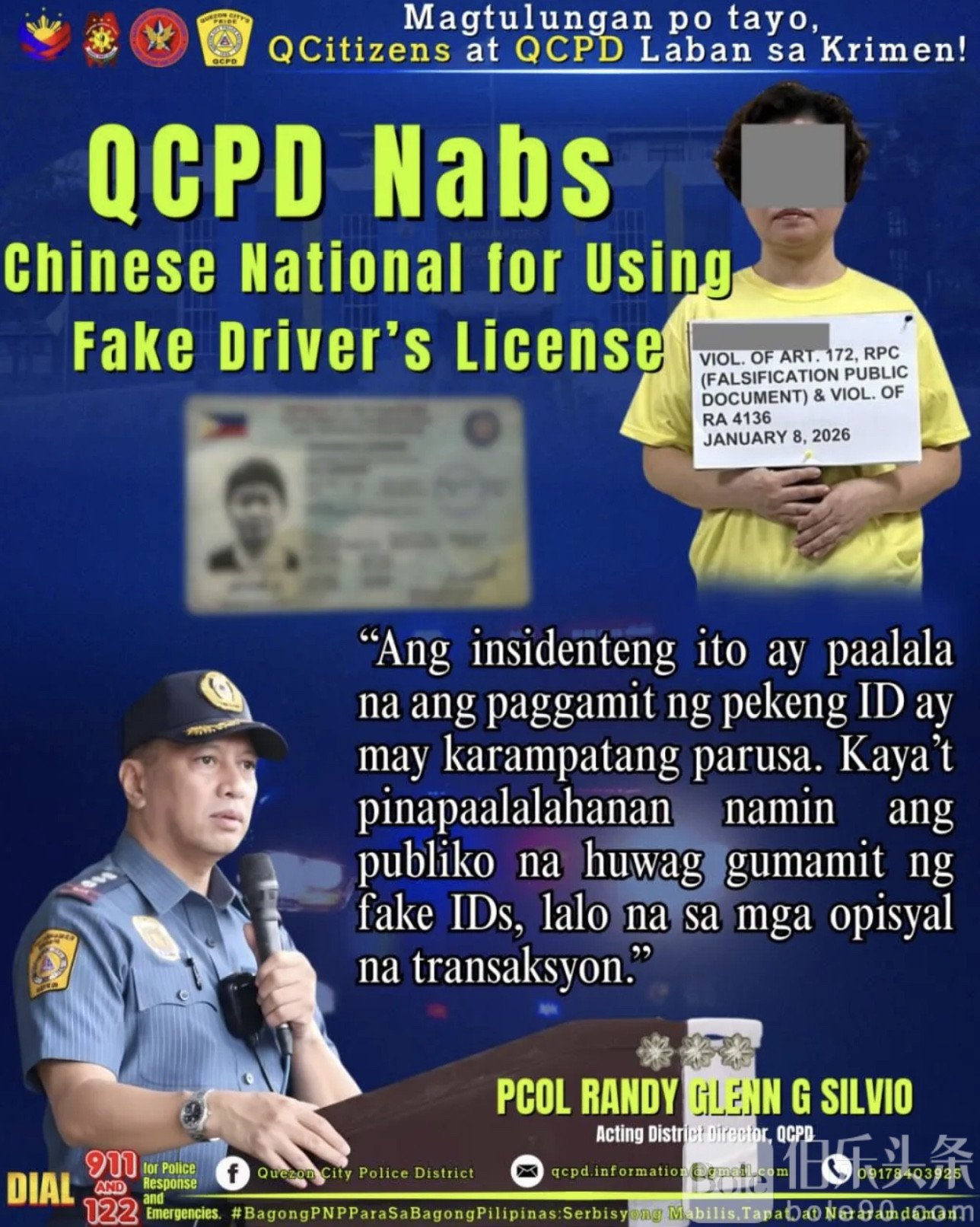 伯乐头条专讯:菲律宾奎松市警方日前通报,一名中国籍女子因在探监时出示伪造驾驶执照,被狱警当场识破并依法拘捕。看似一次普通的探视,却因一张“有问题的证件”迅速升级为刑事案件。