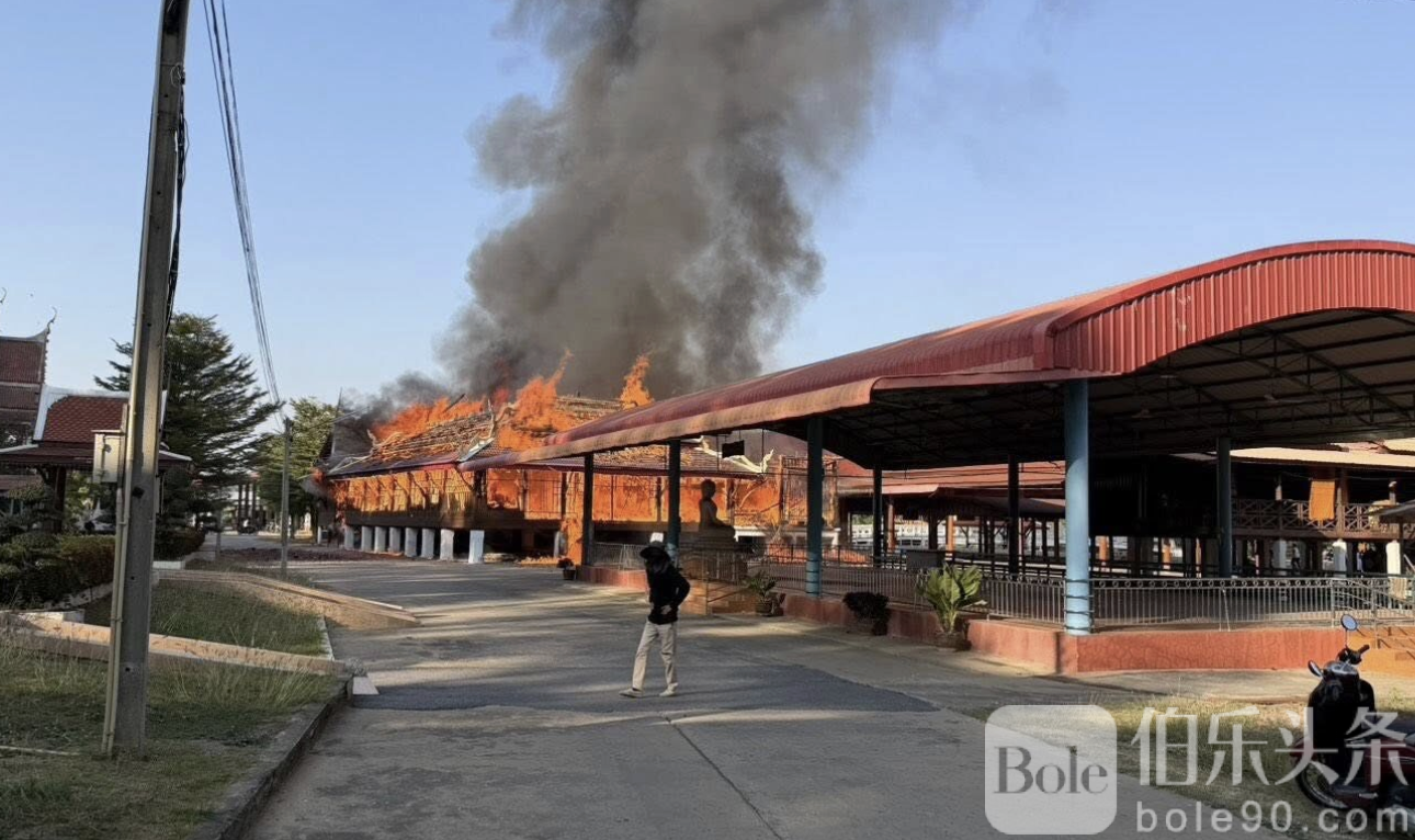 伯乐头条专讯:2026年1月13日下午16时,泰国洛披府塔寇寺突发严重火灾,火势猛烈,法堂瞬间被大火吞噬,现场浓烟滚滚,可远距离清晰可见,造成寺内僧侣和周边民众惊慌失措。