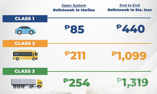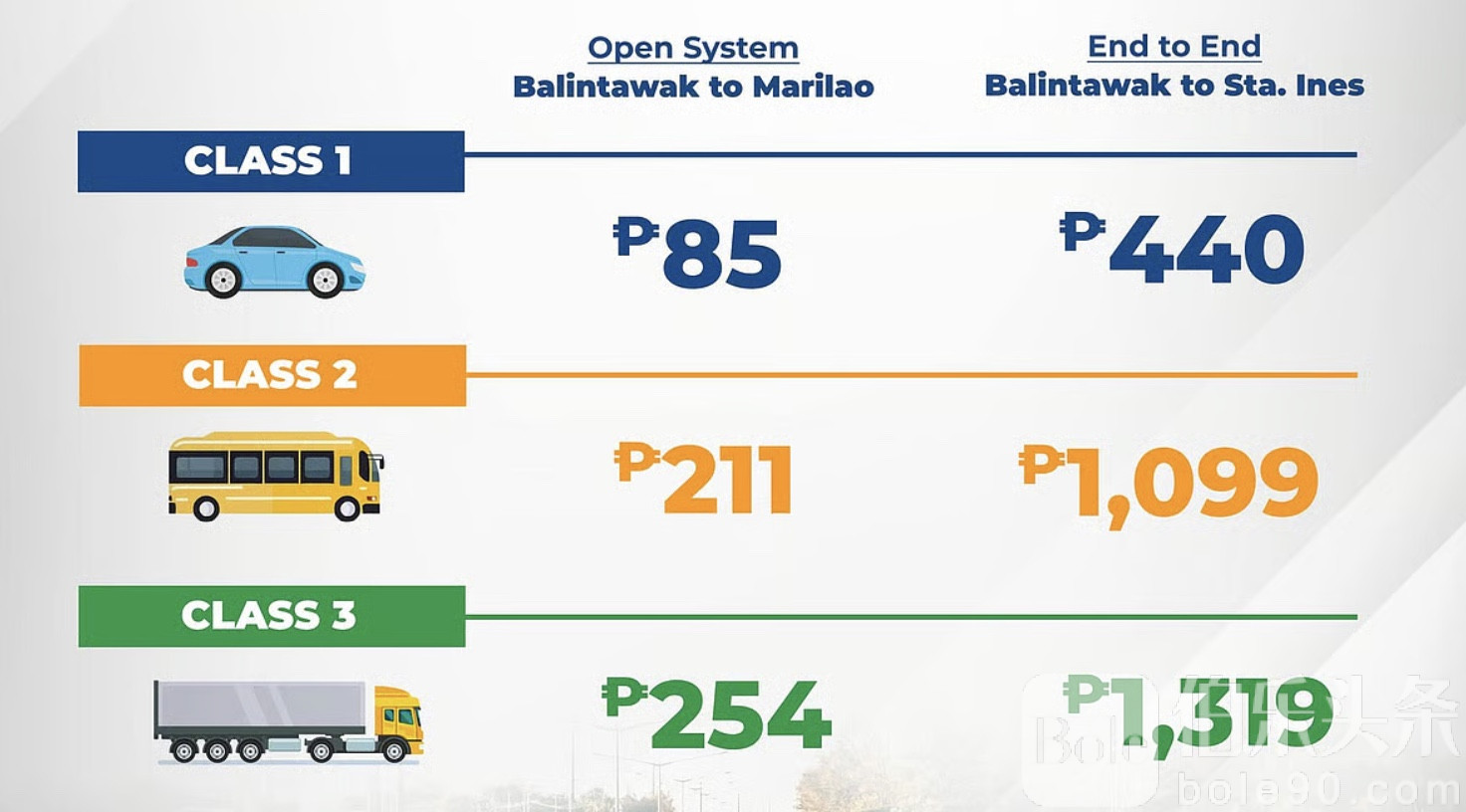 至于封闭式收费系统,范围涵盖布拉干省博考埃至邦板牙省马巴拉卡特市的斯达·伊内斯,以及苏比克—蒂波路段。若从马尼拉一路行驶至马巴拉卡特,全程下来,1类车辆需多支付24比索,2类与3类车辆则分别增加60比索和72比索。