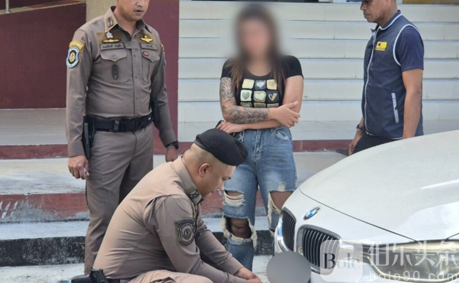 伯乐头条专讯:泰国警方近日在南部攀牙府成功查获一起使用伪造车牌及假年度税标的案件,一名32岁女子驾驶白色宝马轿车上路时,因车牌样式异常引起公路警察注意,最终被查出涉嫌伪造并使用国家官方文件,当场遭到拘捕。