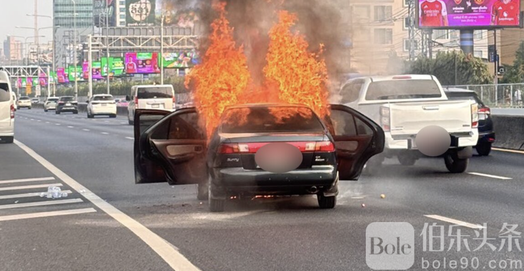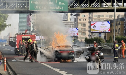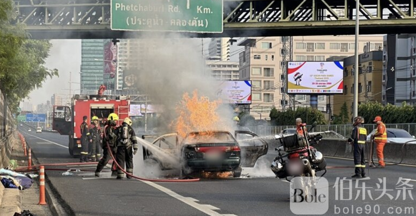 伯乐头条专讯:泰国曼谷市中心今早发生一起惊险火烧车事故,一辆黑色轿车在无线电路路段突发起火,现场火焰冲天、浓烟滚滚,整辆汽车迅速被烈焰吞噬,所幸事故未造成人员伤亡。