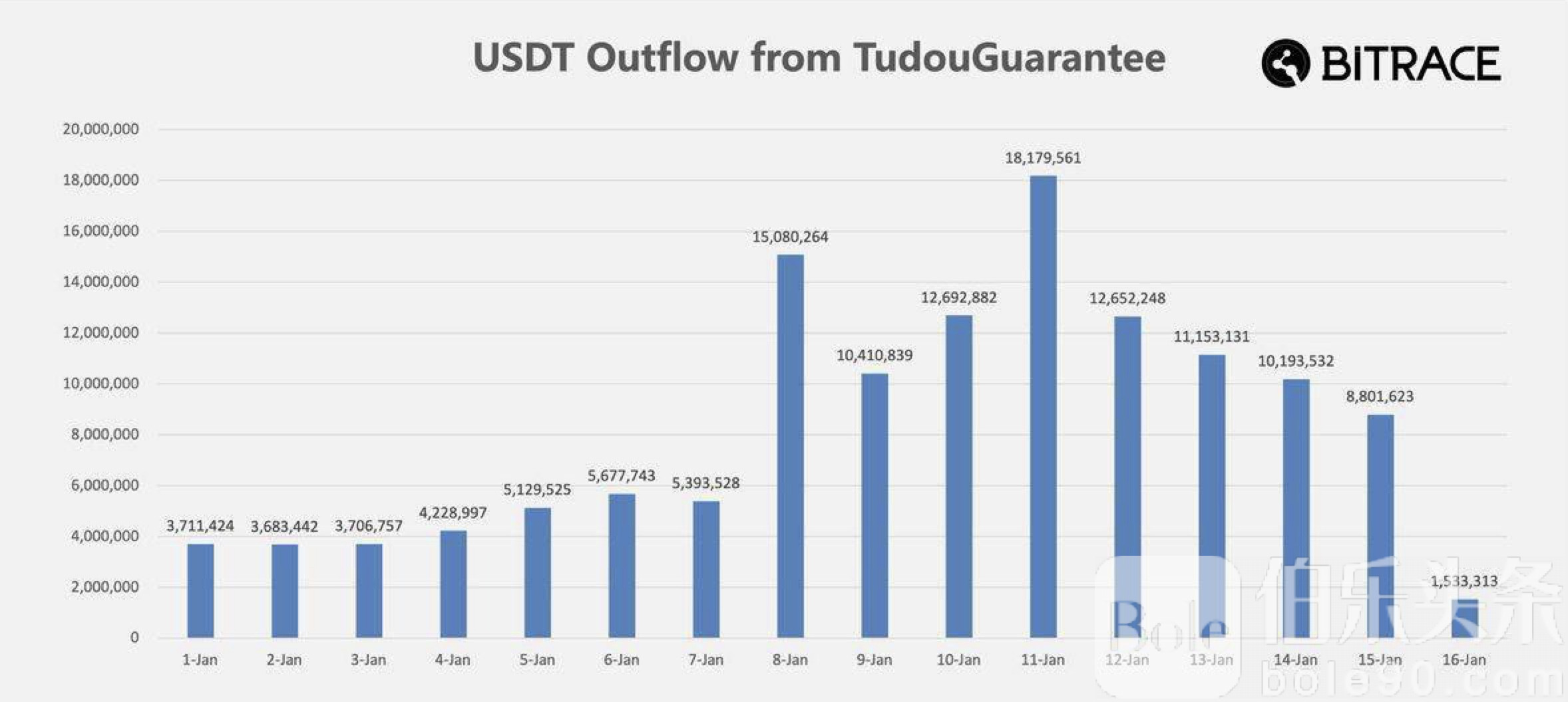伯乐头条专讯:区块链分析公司比特追踪(Bitrace)最新监测数据显示,加密资产担保平台“土豆担保”已于1月8日悄然启动对商户的大规模退款行动。短短半个月内,资金回流规模迅速放大——从2026年1月1日至1月16日,累计退款金额已超过1.3亿USDT,资金流向在链上清晰可见。
